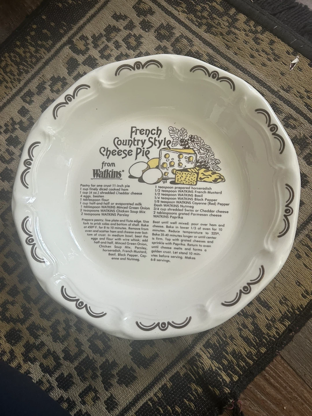 Selling a lovely Watkins French Country Style Cheese Pie dish! It features a charming design with the recipe printed right on the dish. Perfect for baking and serving your favourite cheese pie recipe!