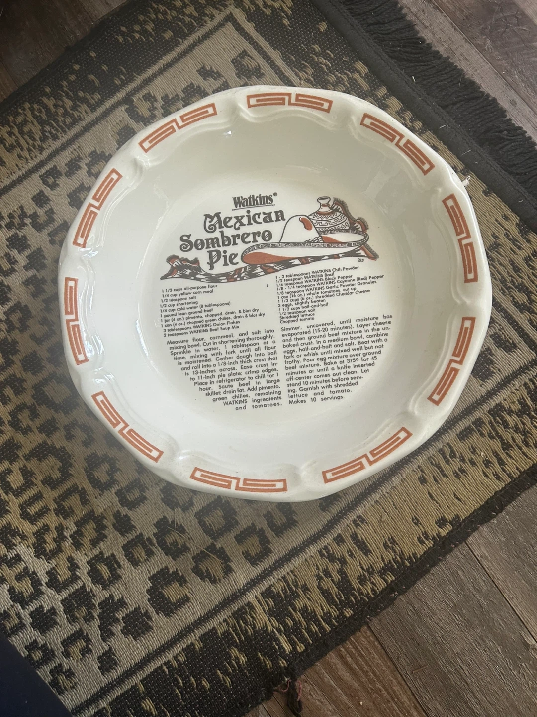 Vintage Watkins Mexican Sombrero Pie Plate featuring the recipe right on the plate! A unique piece for baking or display