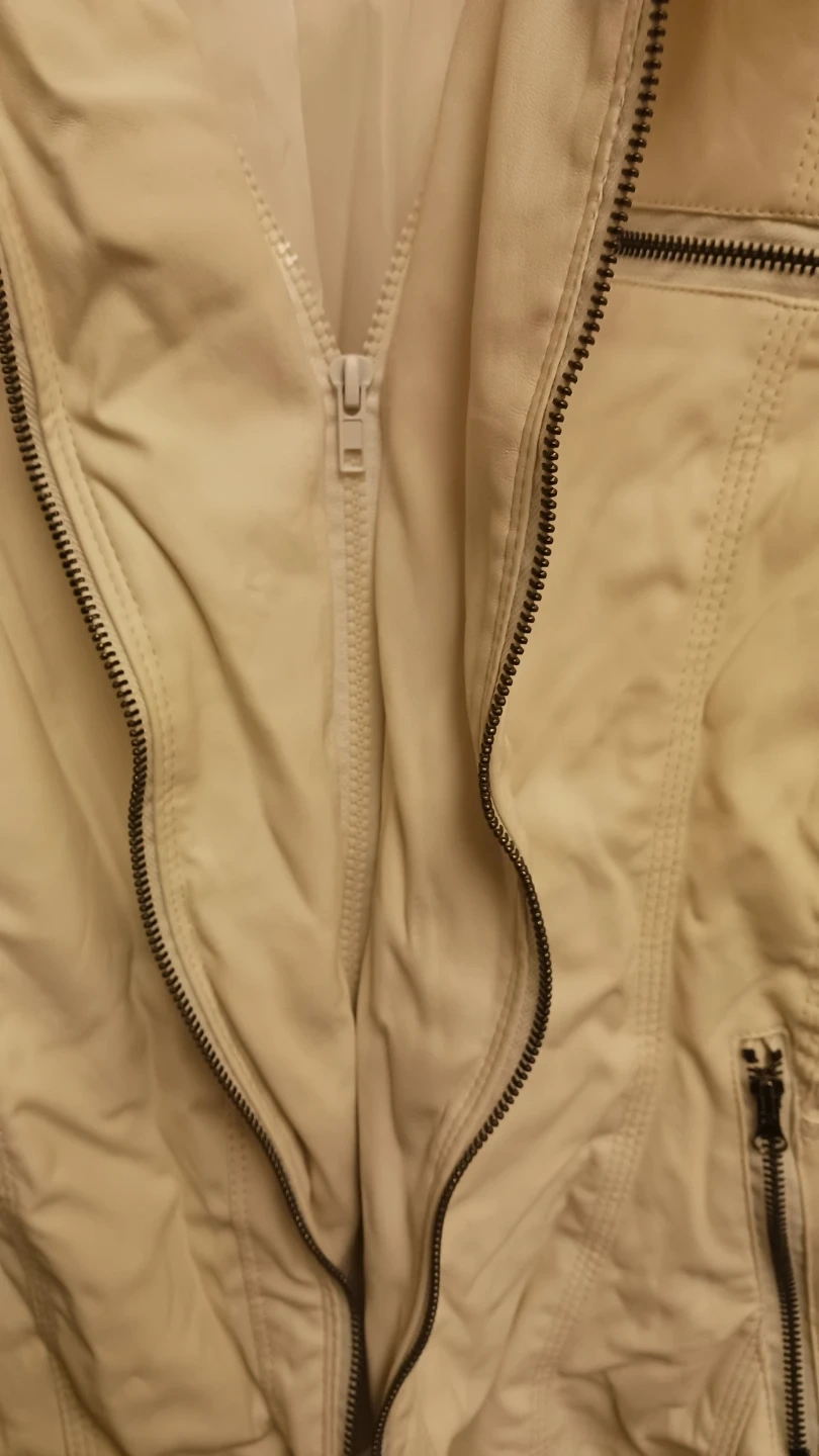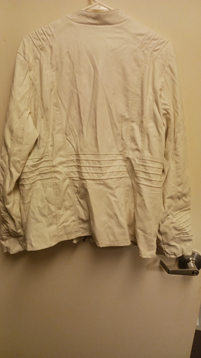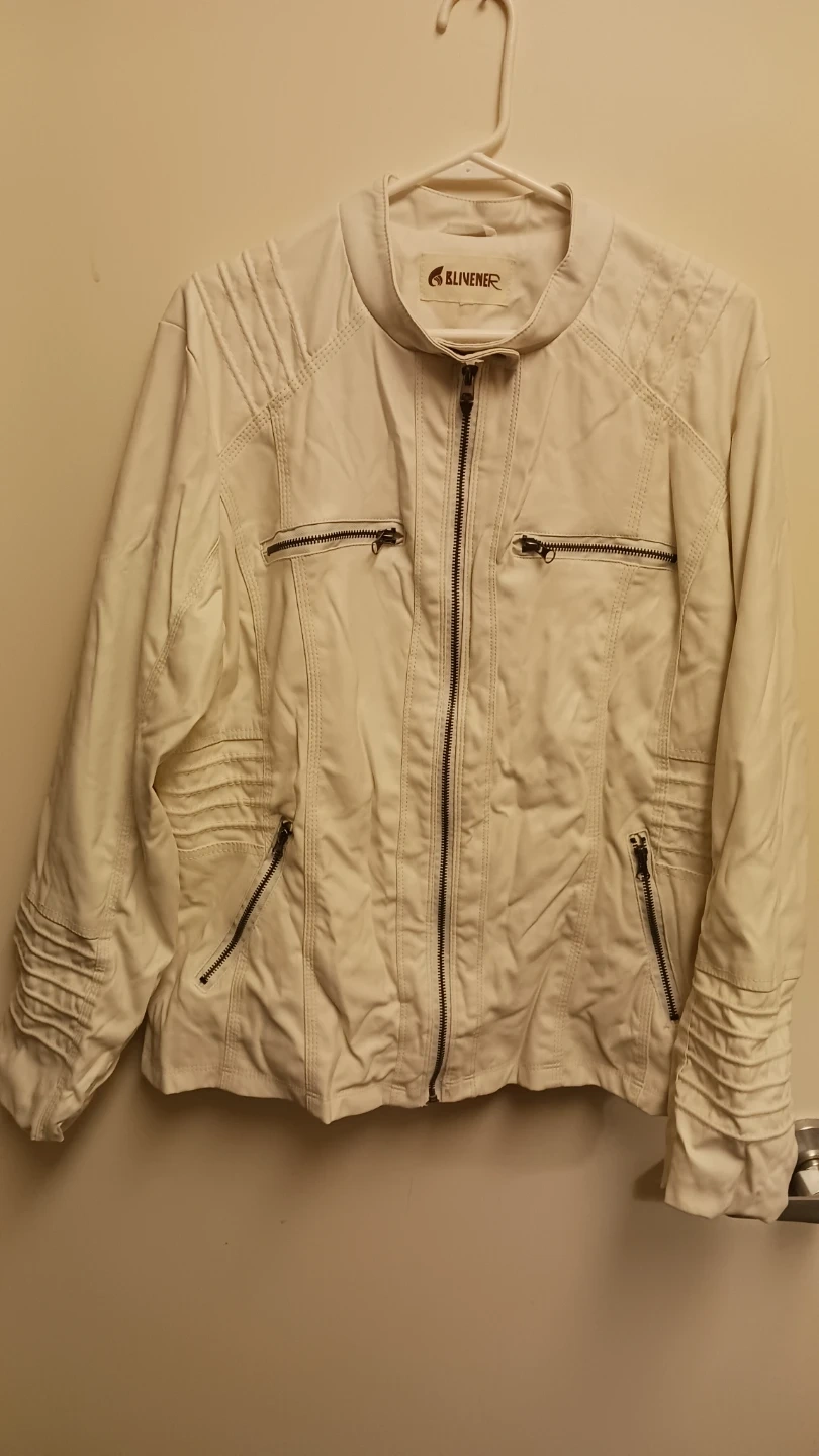 Giving away a cream-coloured soft vinyl jacket from Blivener. It's in great condition and ready for a new home! The jacket features a zippered front and stylish detailing. Hang it in the washroom while you take a hot shower and it can steam out the wrinkles! 😶🌫️☺️