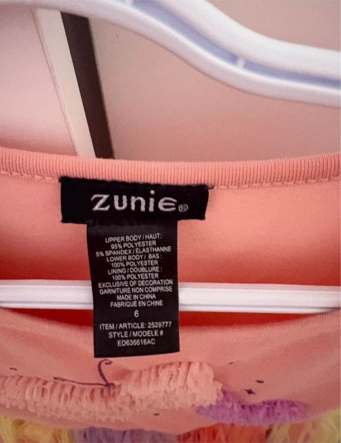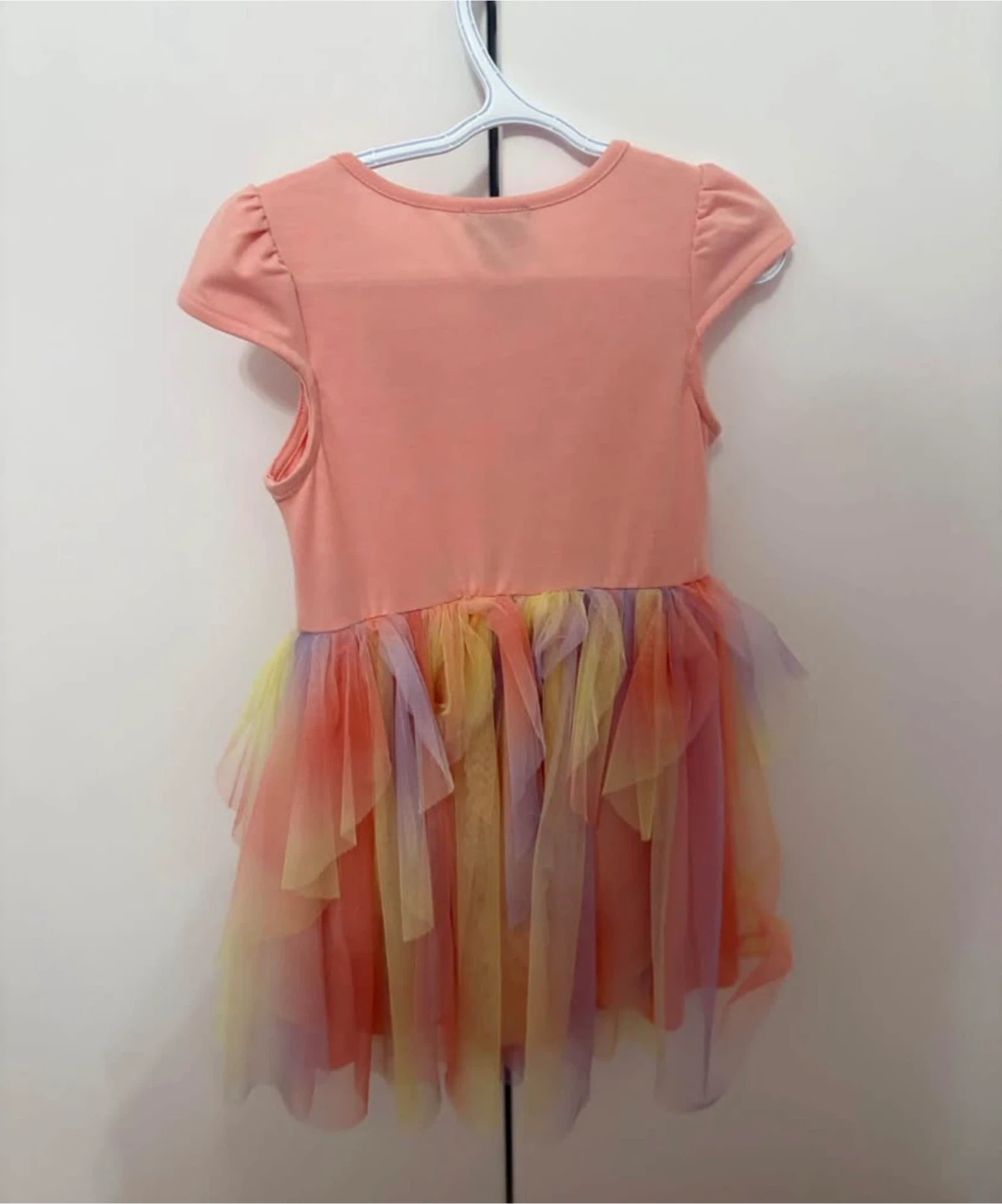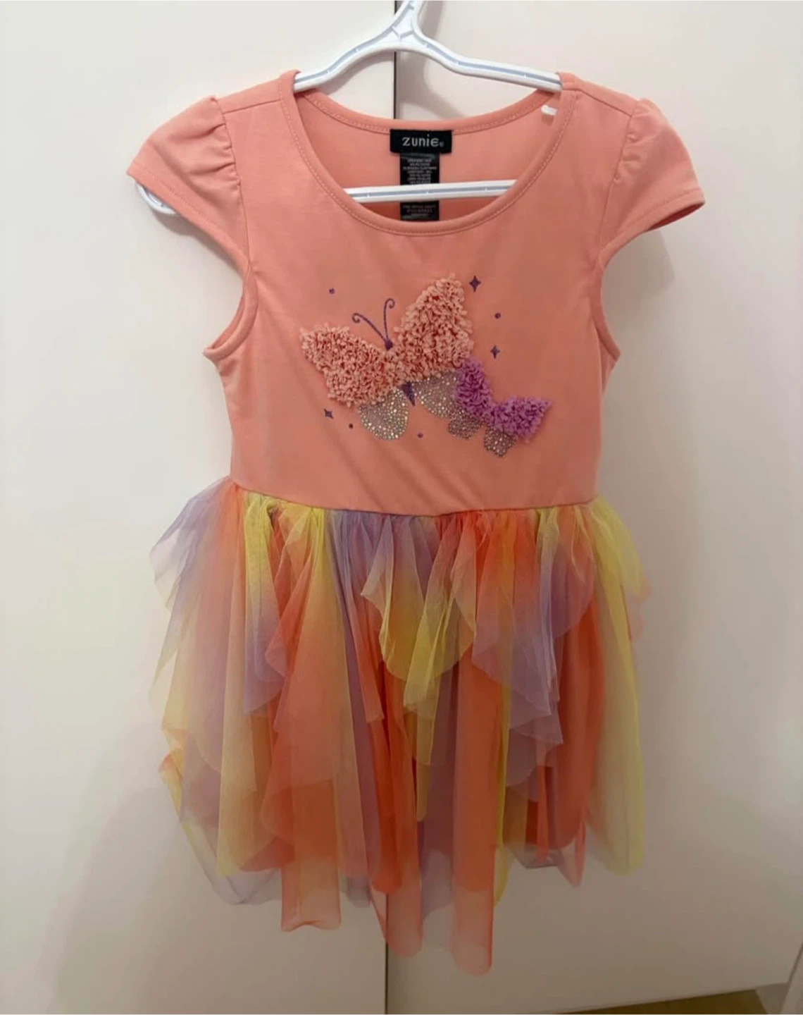 This adorable Zunie dress is perfect for your little one! It features a cute butterfly design on the upper body and a colourful tulle skirt. The dress is a size 6.