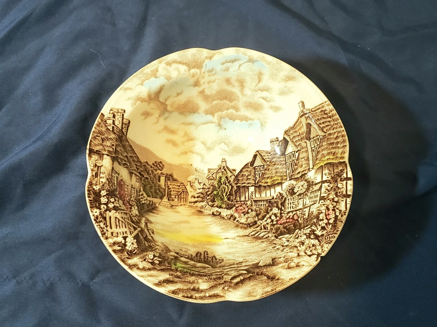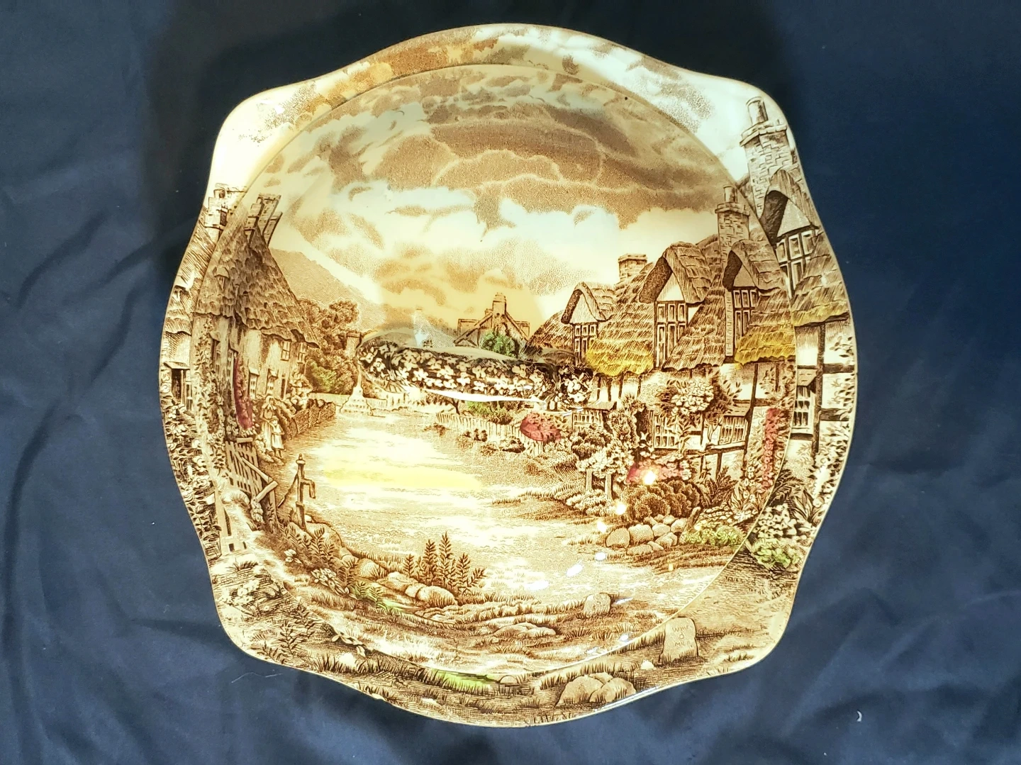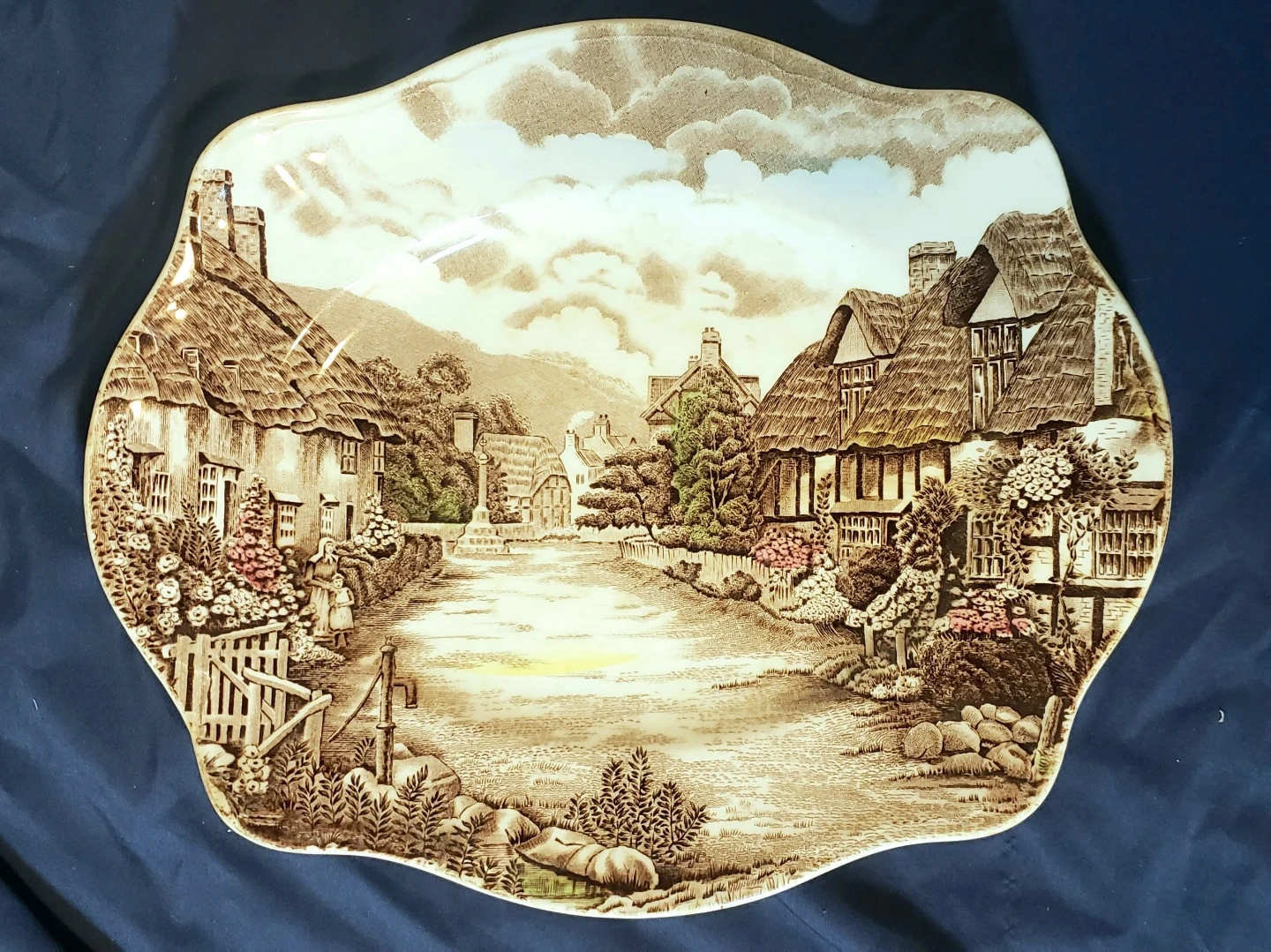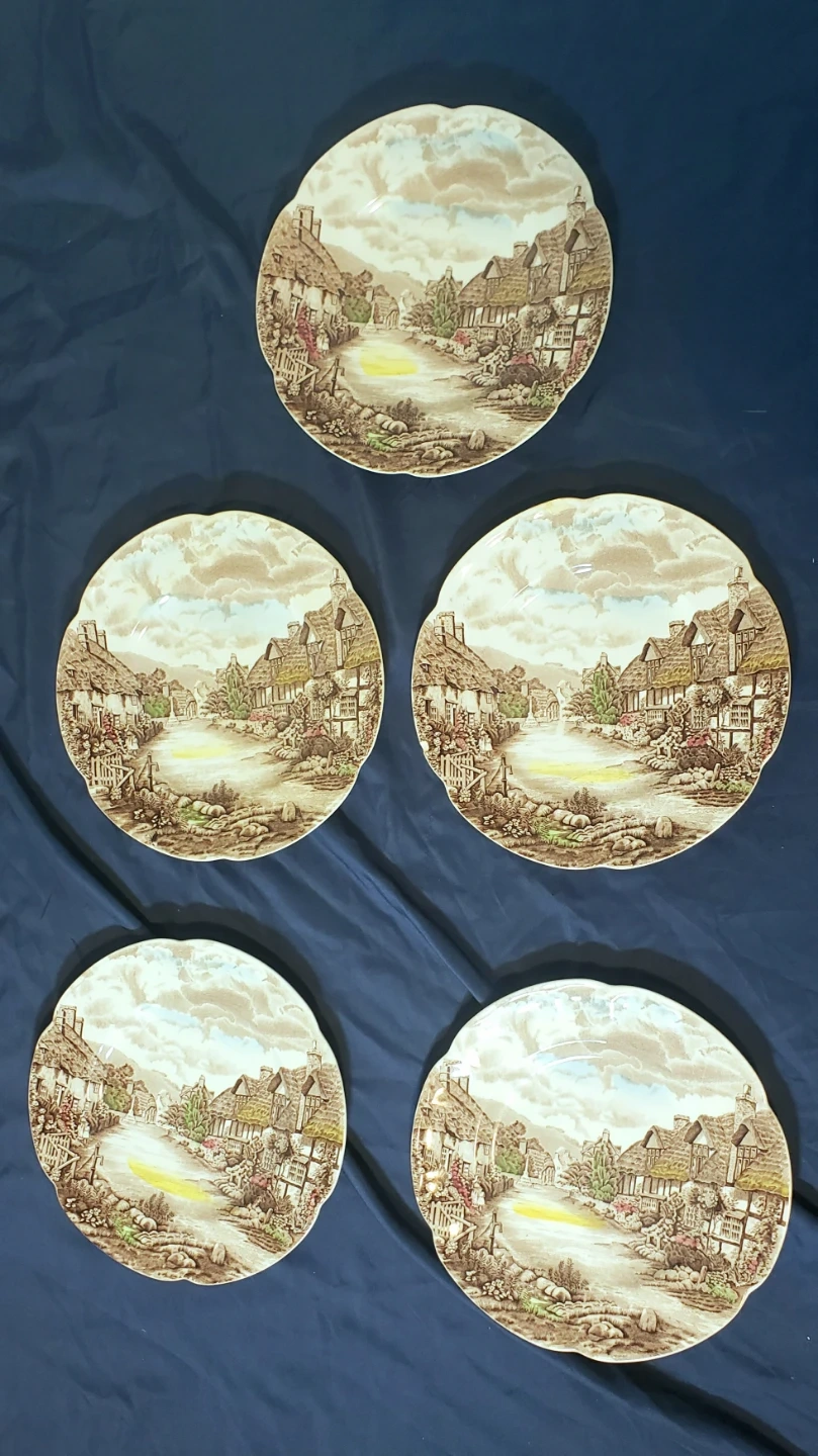 All pieces have the same scene painted on them, a road leading through a sepia-toned English hamlet. The bottoms are all white.