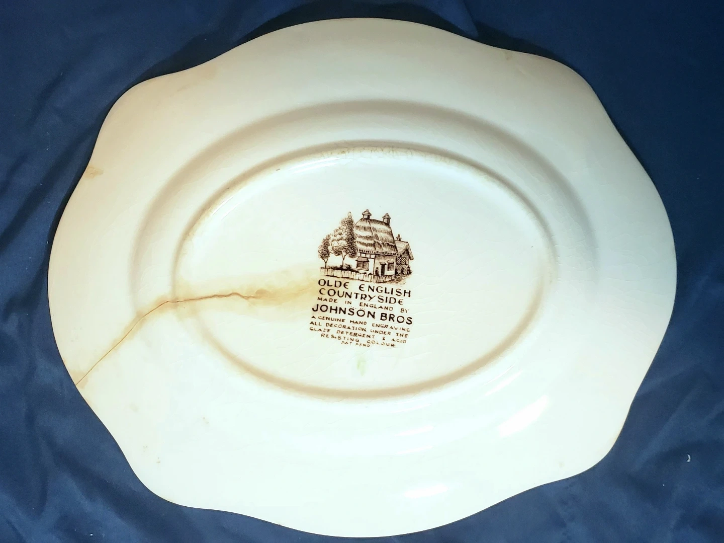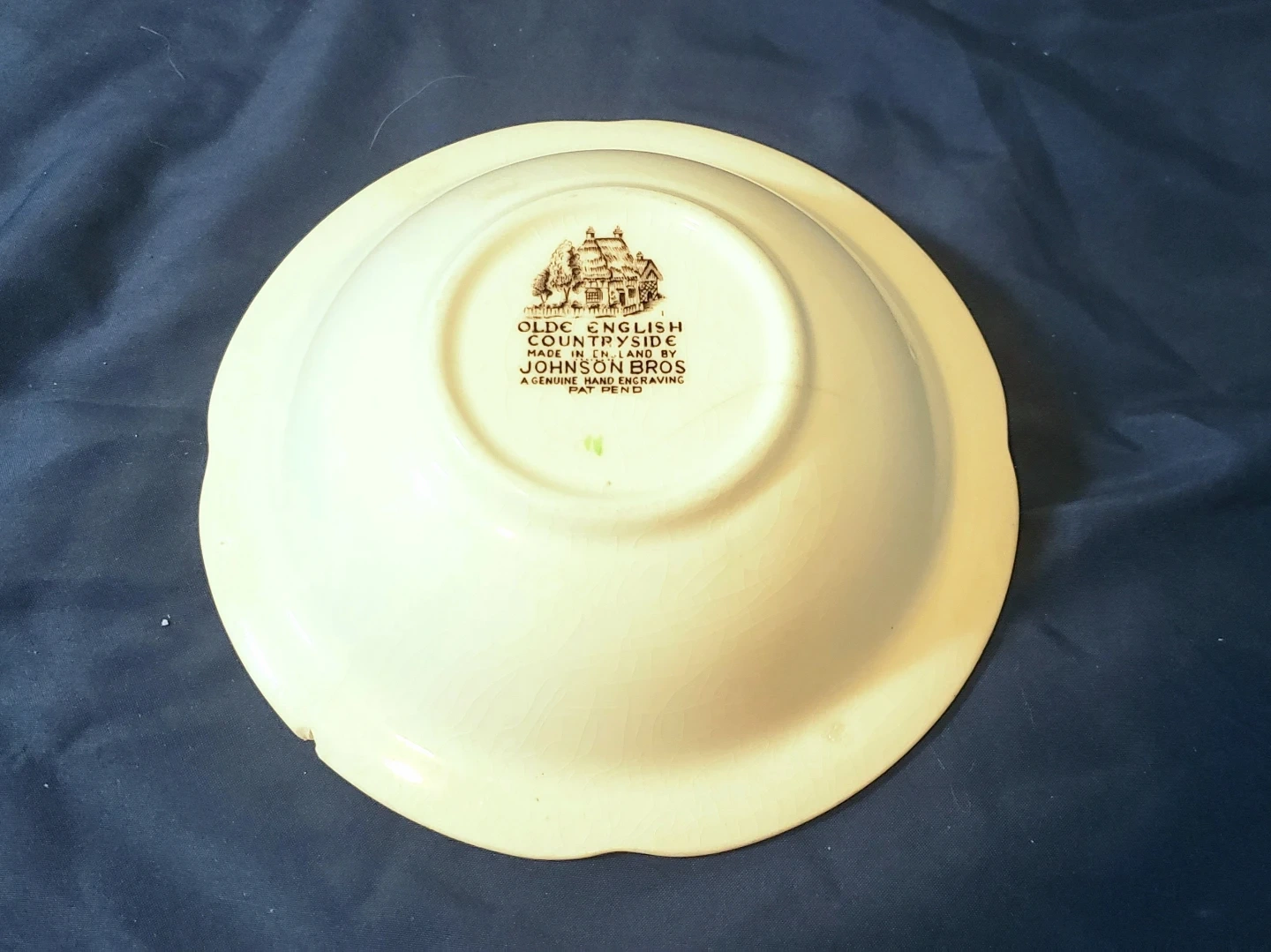 Bring home this 9 piece dining ware set from Johnson Bros. today! Includes 5 dinner plates, 2 platters ( 1 large, 1 medium), 1 covered serving dish and 1 bowl. These are all from the Olde English Countryside line and were hand-painted in England. Produced in the 1970's.