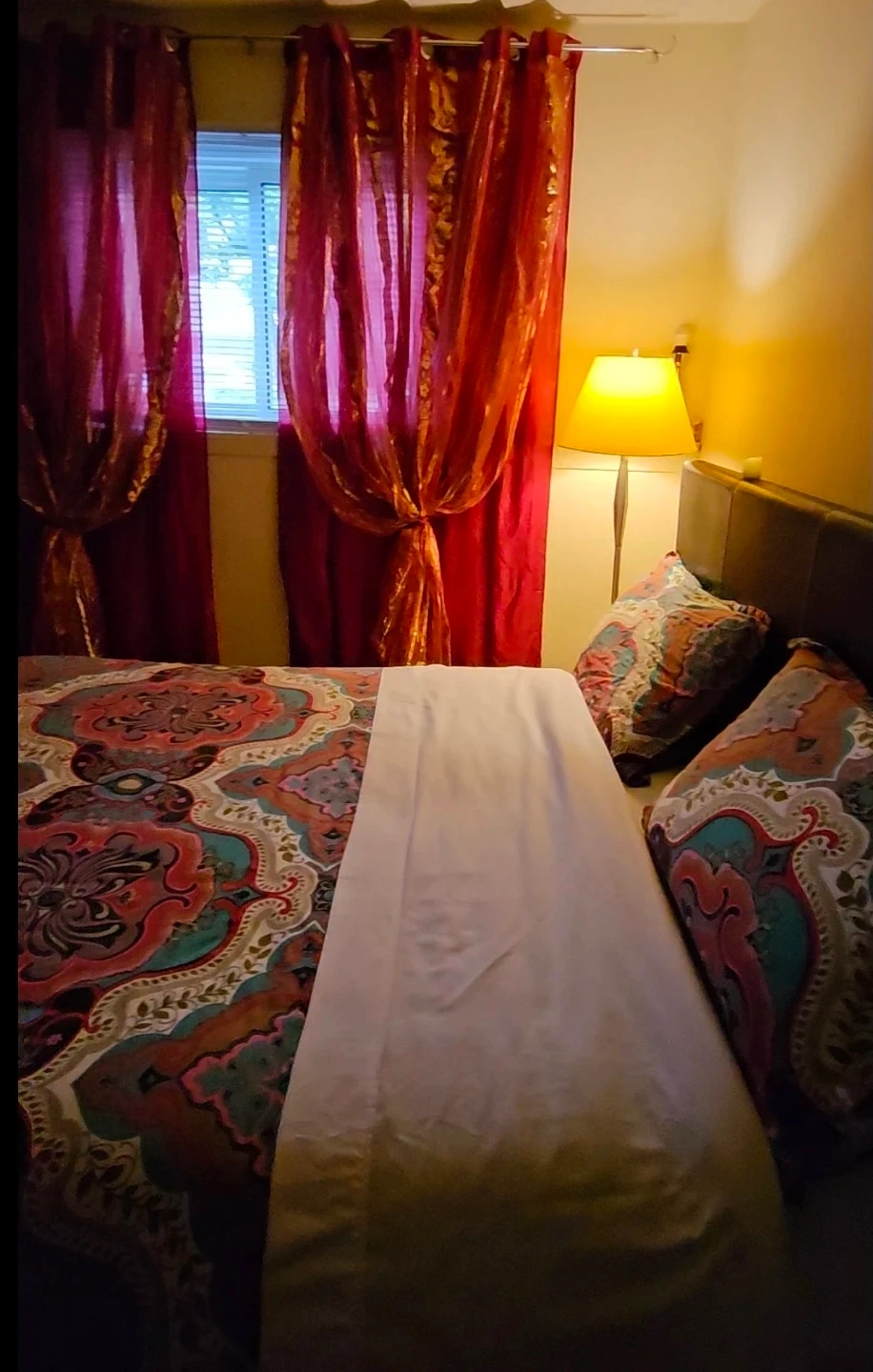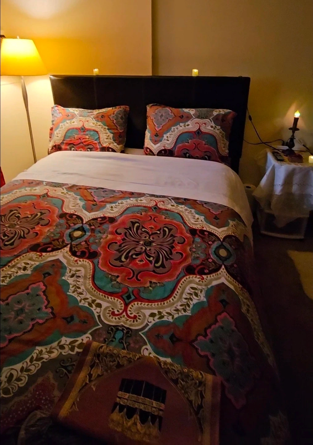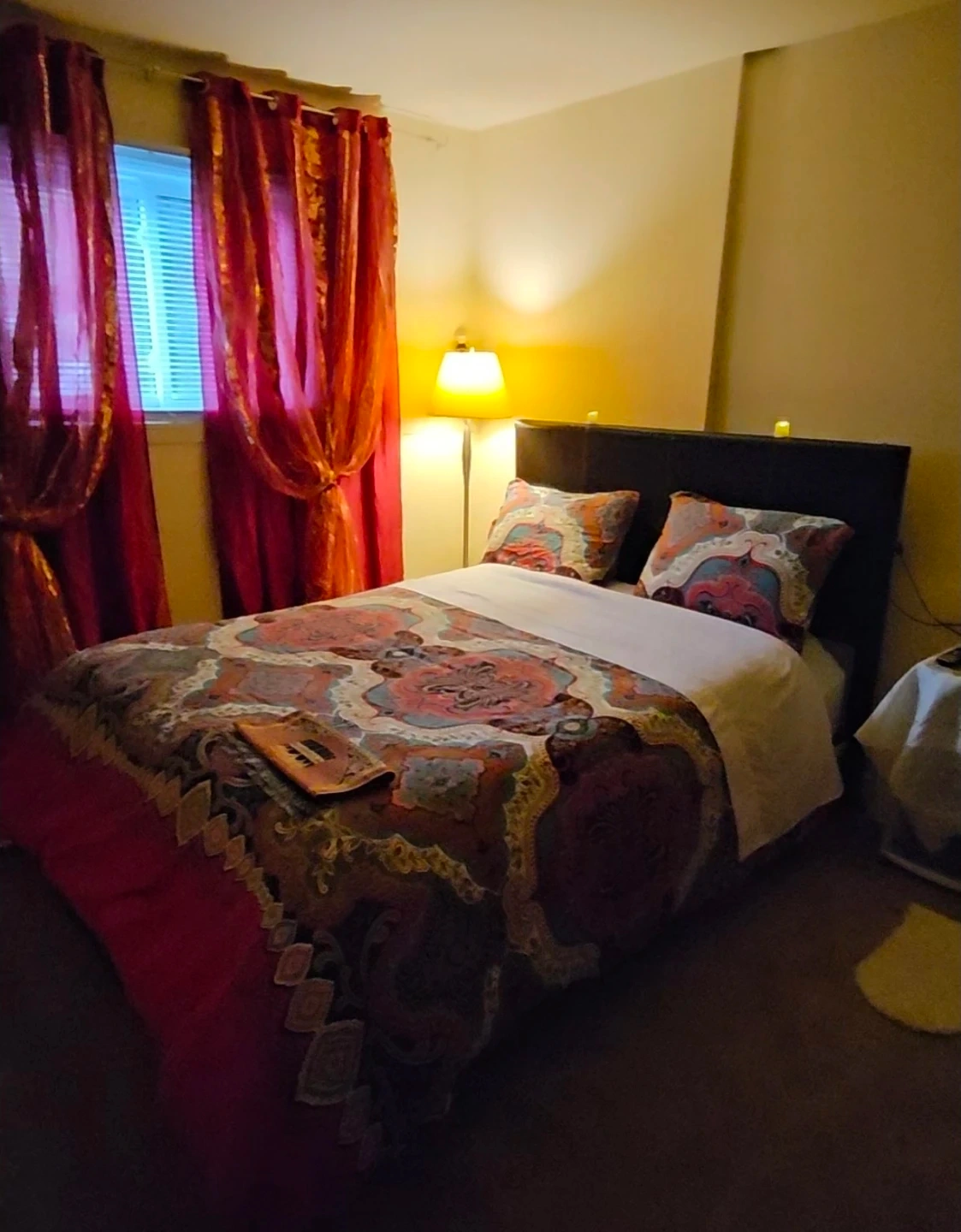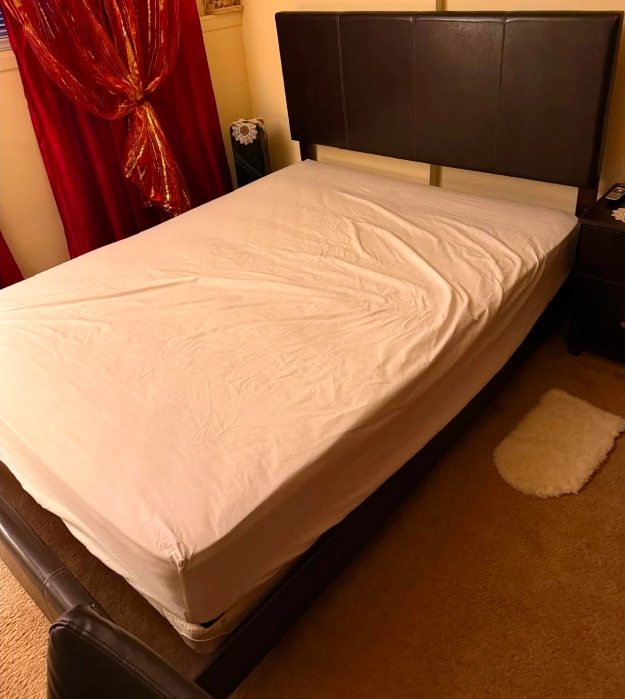 Selling a queen-sized bed frame with a dark brown headboard. It's in good condition and ready for a new home. The headboard is a nice dark brown colour. Perfect for a bedroom upgrade!