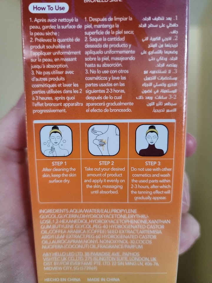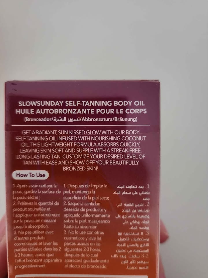 Packaging says: Get a radiant, sun-kissed glow with our body self-tanning oil infused with nourishing coconut oil. This lightweight formula absorbs quickly, leaving skin soft and supple with a streak-free, long-lasting tan. Customize your desired level of tan with ease and show off your beautifully bronzed skin.