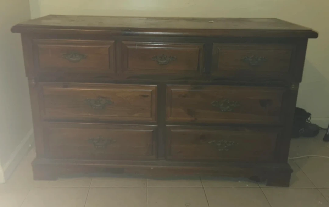 Selling a wooden dresser with 7 drawers. It's a great piece for adding storage to any bedroom or living space. The dresser has a classic design with a warm wood tone. Perfect for organizing your clothes and other belongings!