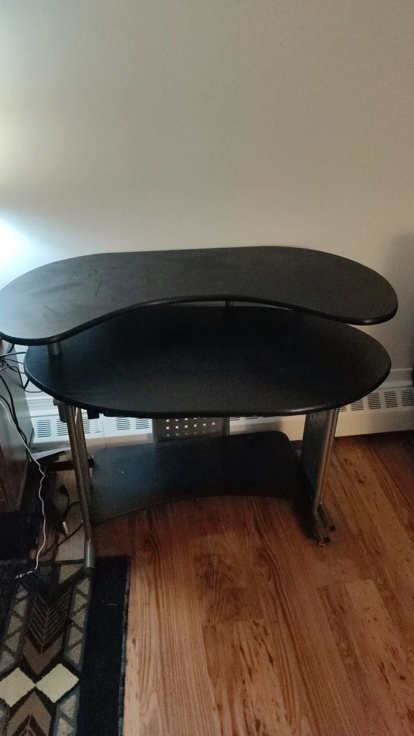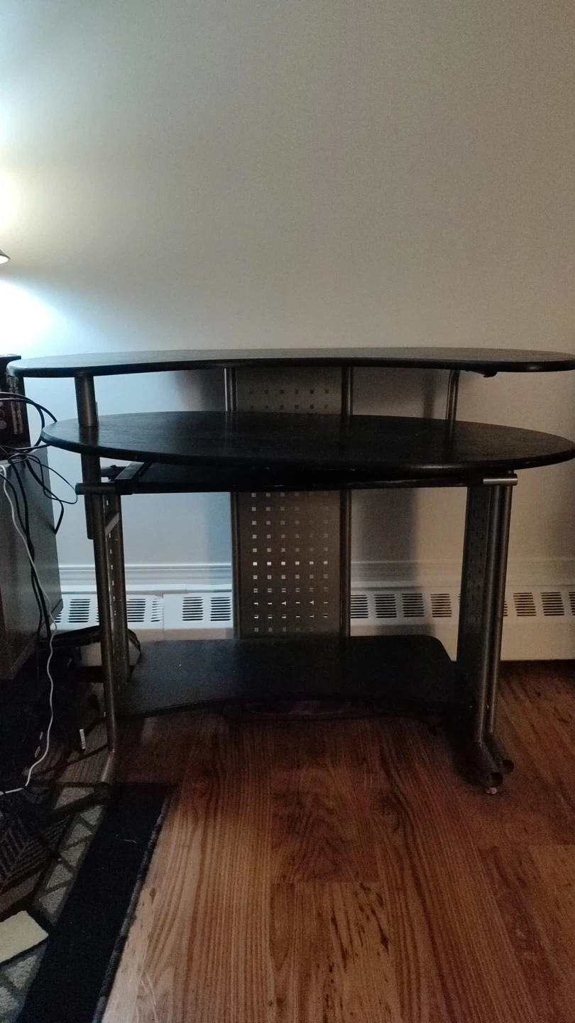 Wooden computer desk with mental frame and a two-tiered design. The bottom level comes out but the leg needs fixing quick is a quick fix.