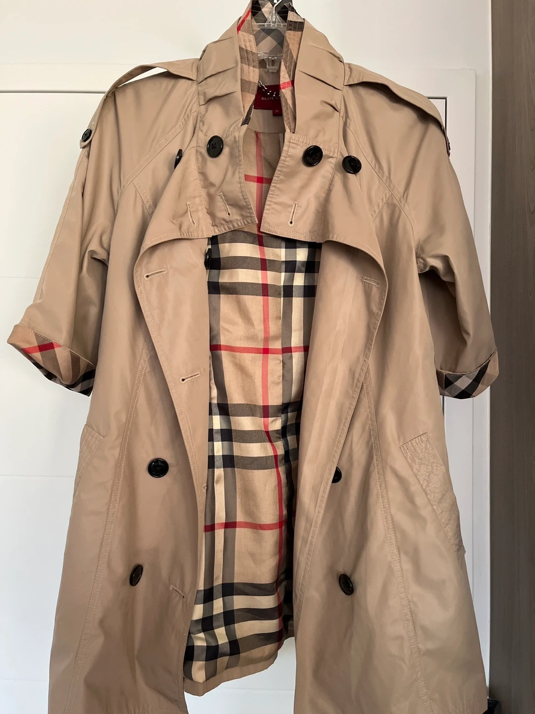 Selling a stylish short sleeve trench coat! It's in great condition and features the classic plaid lining. Perfect for adding a touch of sophistication to your wardrobe.