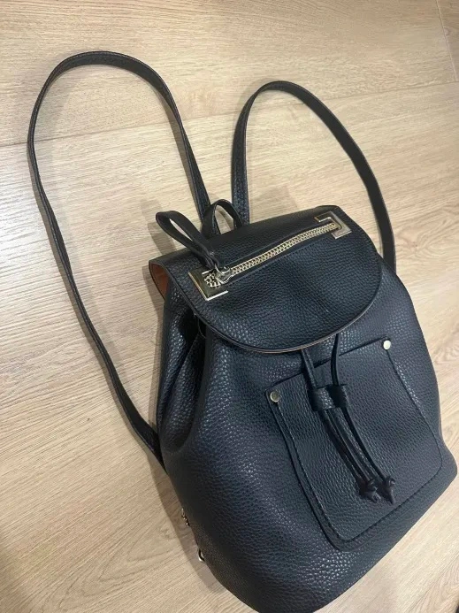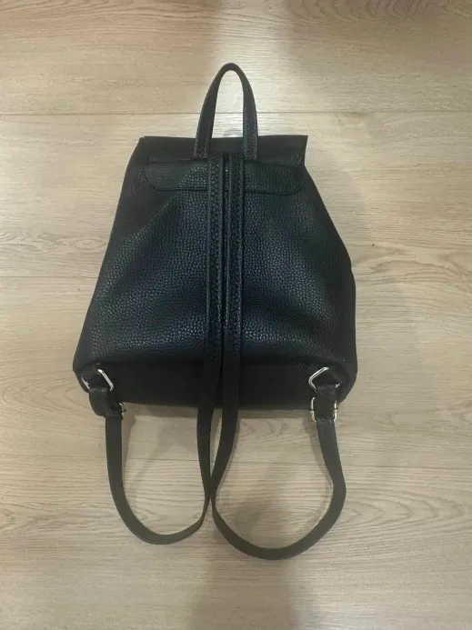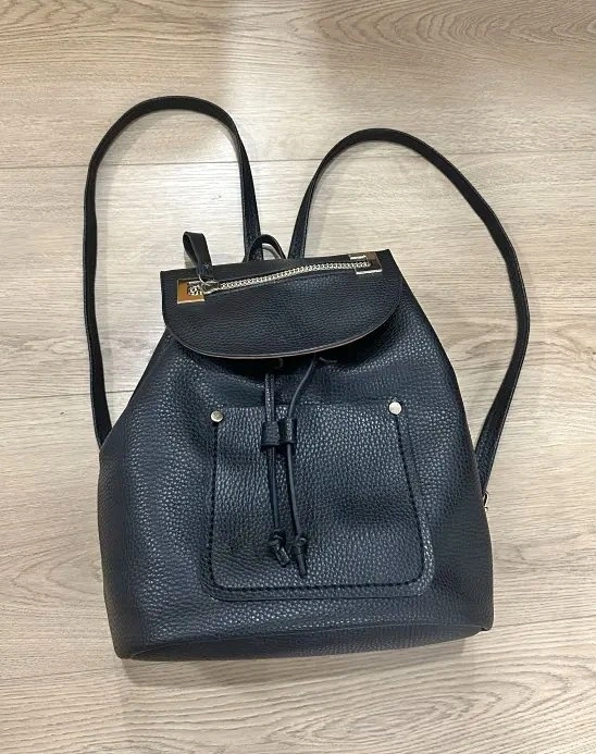 Stylish and functional La Diva backpack featuring a drawstring closure with a magnetic flap. High-quality pebbled leather exterior with multiple organizational pockets. Excellent everyday bag that fits all your essentials. Very clean.