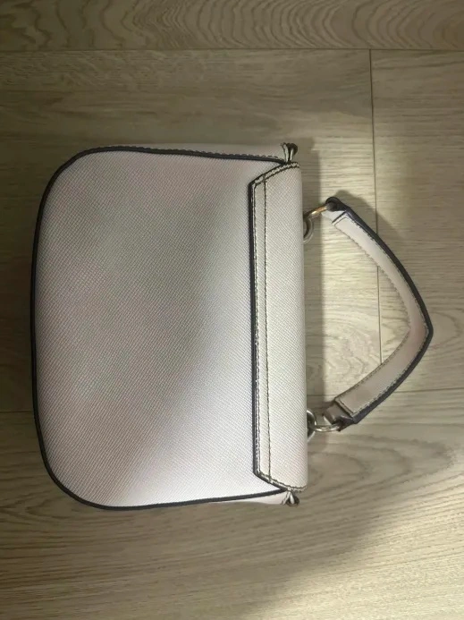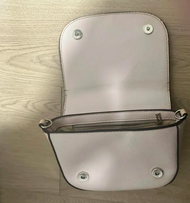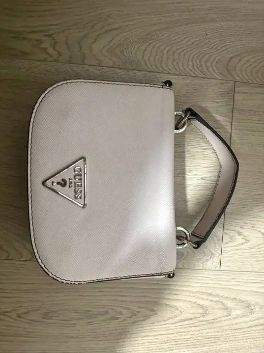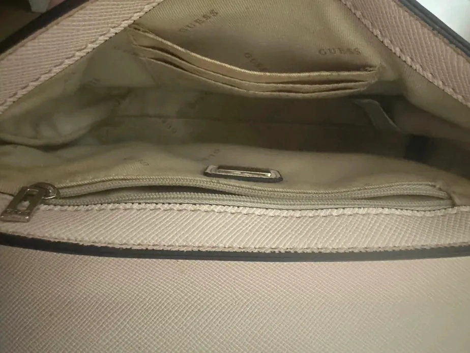 Beautiful Guess crossbody bag with signature triangle logo. Features a top handle and a magnetic flap closure. Interior is clean with a zip pocket for organization. Great condition for everyday use.
