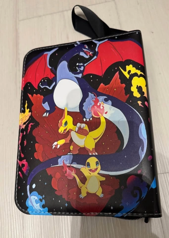 Pokemon binder, filled with 200 cards. The cards included are holos/reverse holos, rares, commons and uncommons, trainers and energies from all different types of Pokémon. The binder has a handle and zipper for easy carrying.