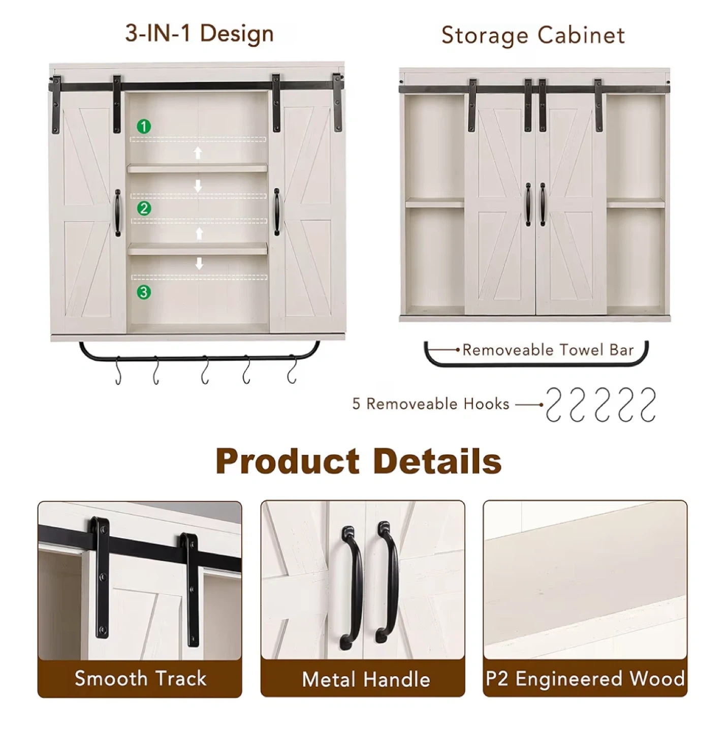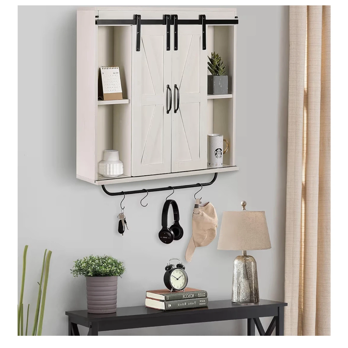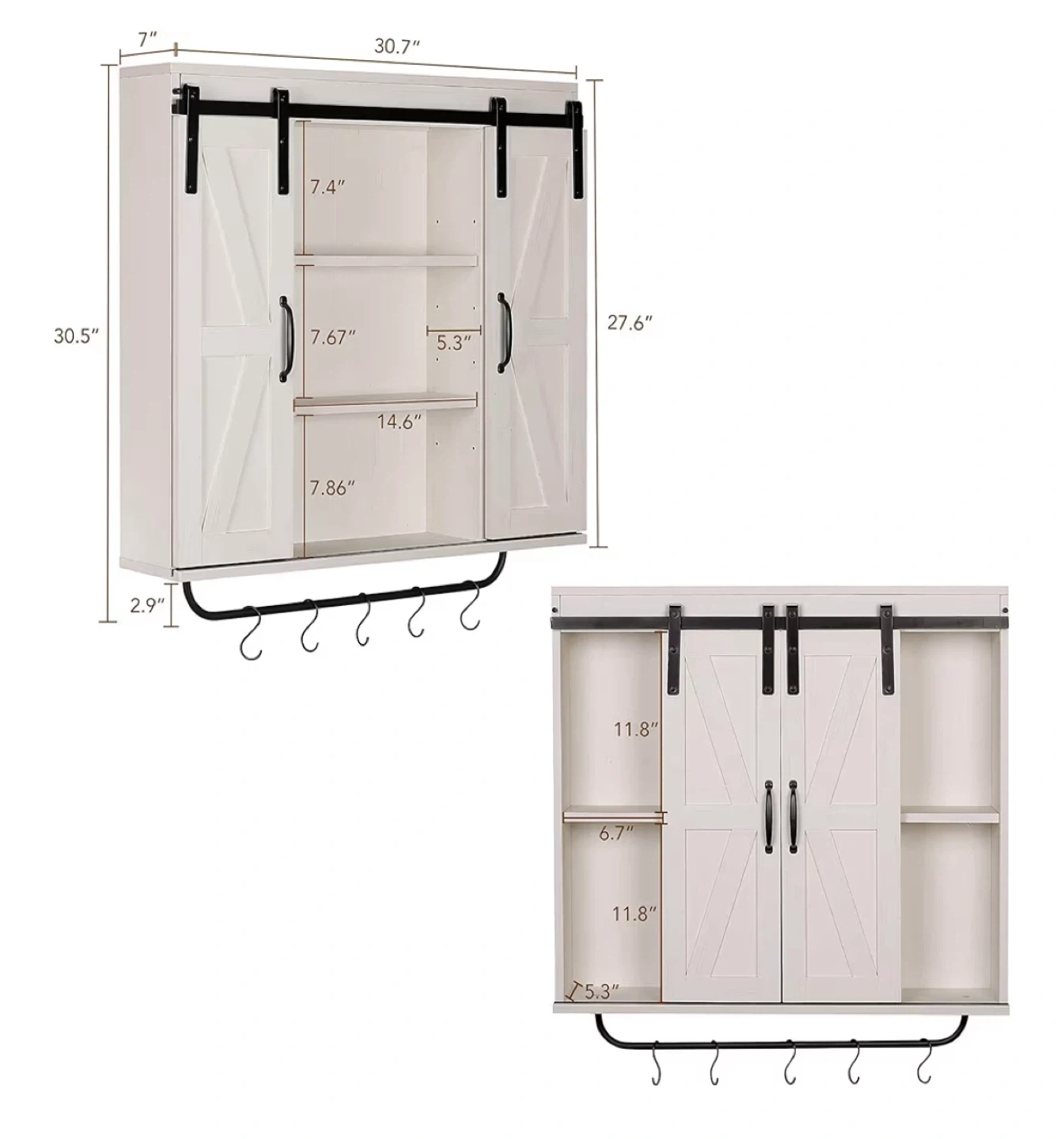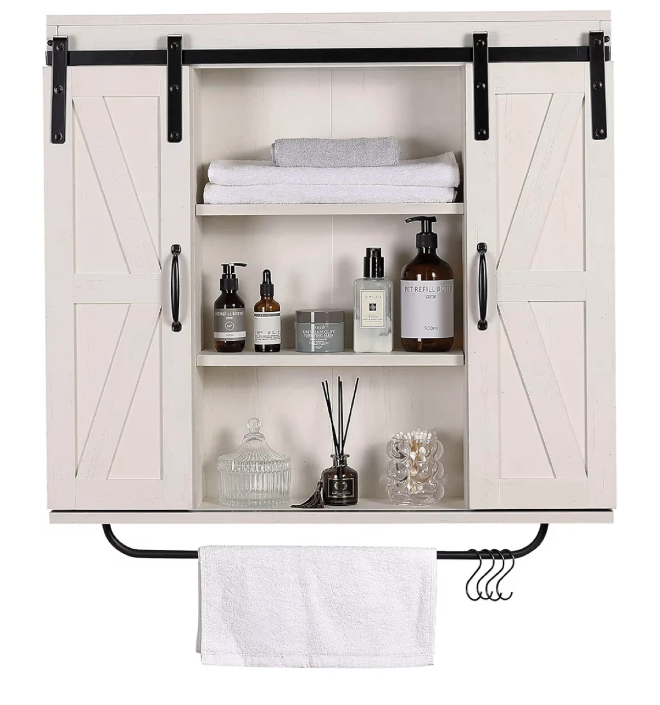 Spruce up your space with this charming RUSTOWN rustic wood wall storage cabinet! It features a vintage white finish and a sliding barn door design, perfect for adding a touch of farmhouse style to your kitchen, dining room, bathroom, or living room. It also has a removable towel bar and 5 removable hooks.