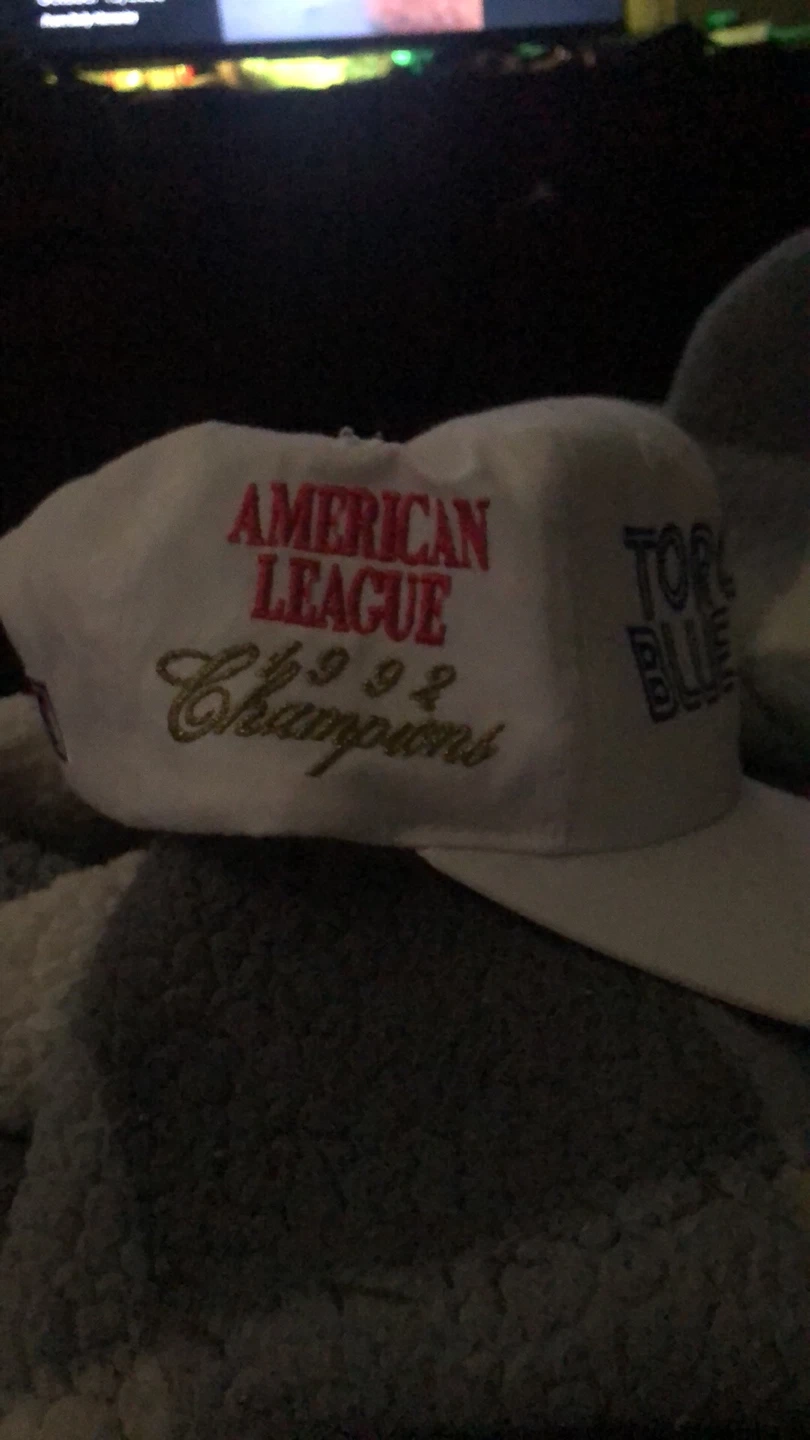 Selling a Toronto Blue Jays hat. It's white and has the World Series logo on the side. The hat also commemorates the 1992 American League Championship