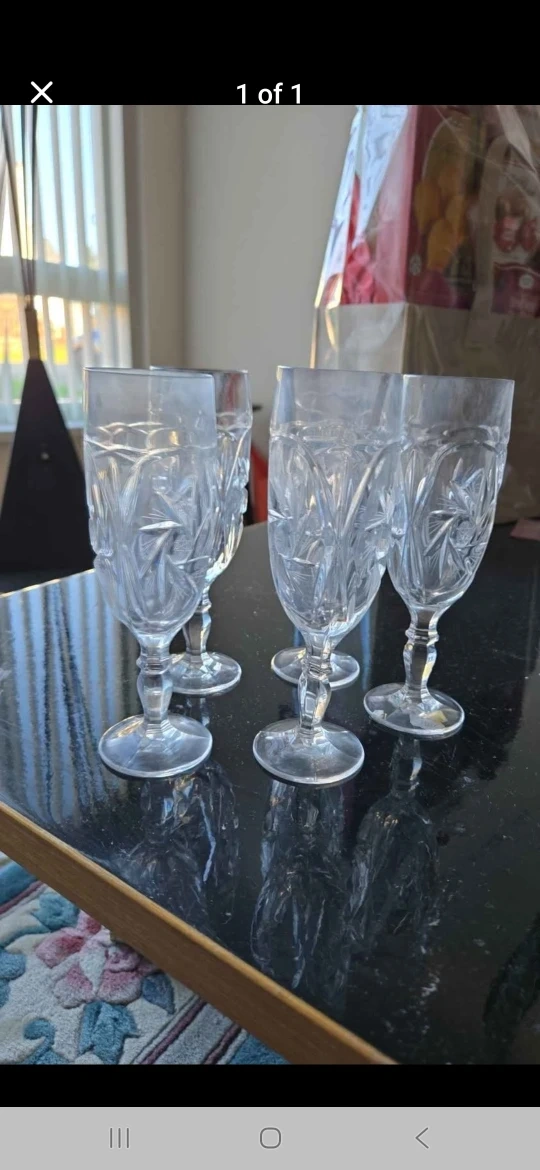 Selling a set of five clear crystal wine glasses. They feature a beautiful cut crystal design. These glasses would be perfect for entertaining or adding a touch of elegance to your dining table.