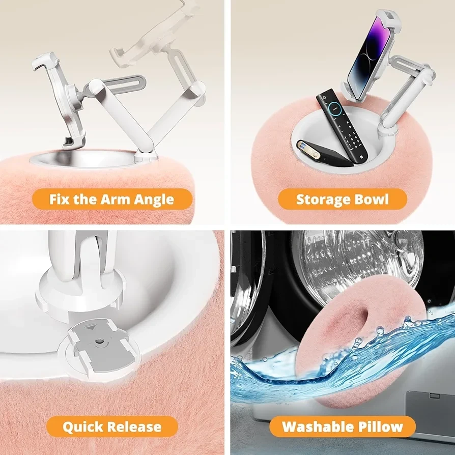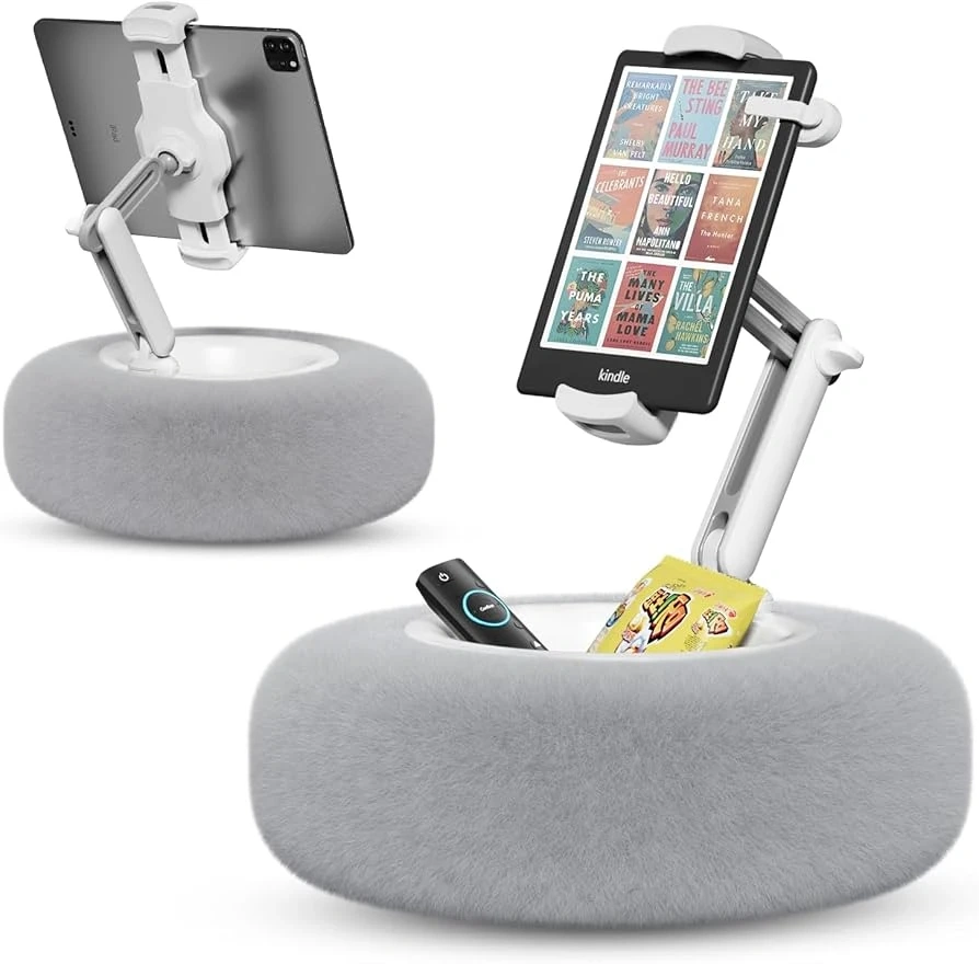 This is a tablet and phone holder with a furry base! It's compatible with 4.7-13" devices. It's angle adjustable and has a storage bowl, and the pillow is washable!