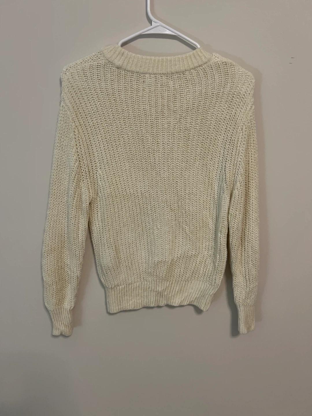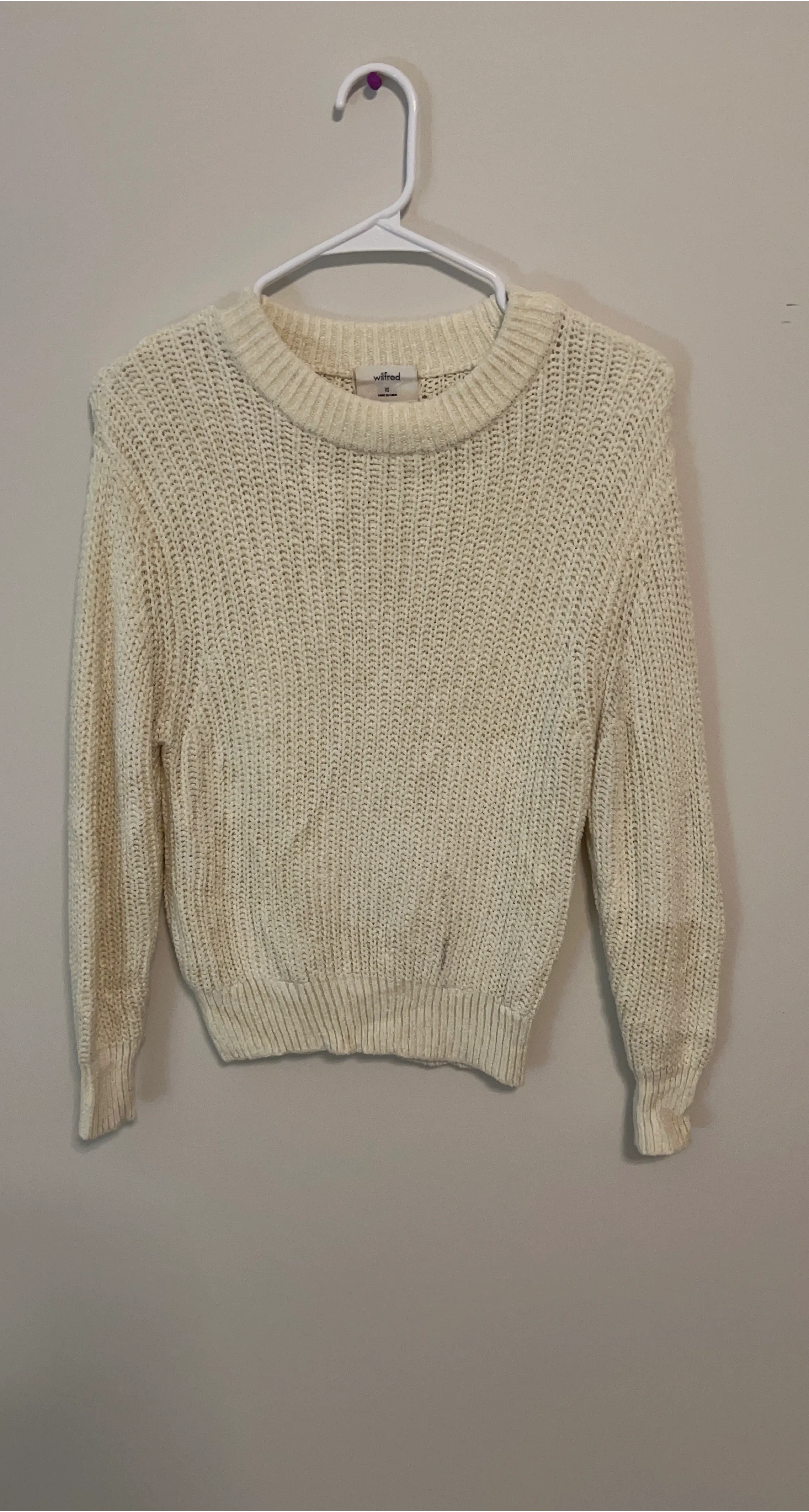 Cozy up in this Wilfred Free cream knit sweater! It's a size medium and perfect for layering or wearing on its own. The neutral colour makes it easy to pair with anything in your closet. It's in great condition and ready for a new home!