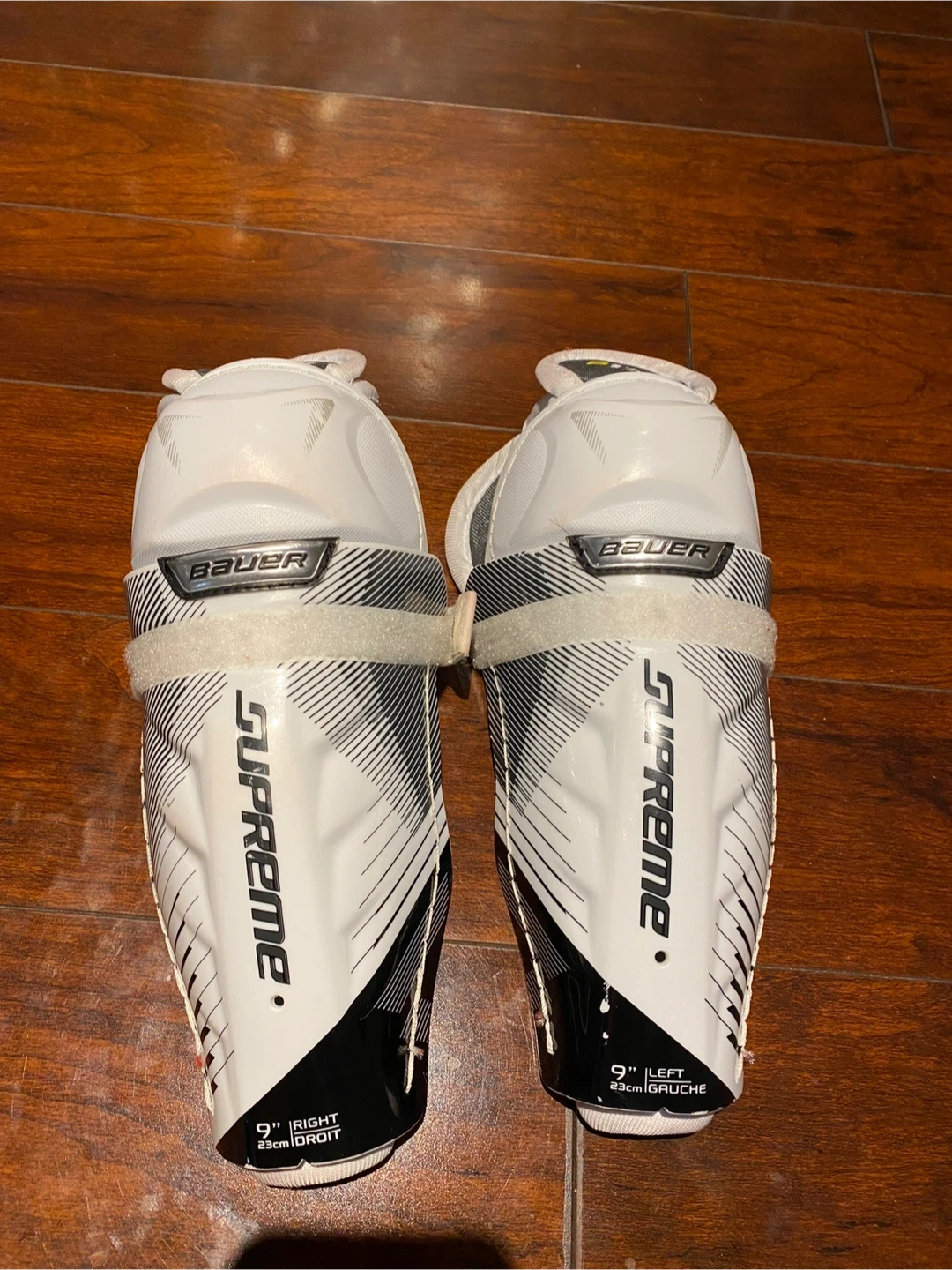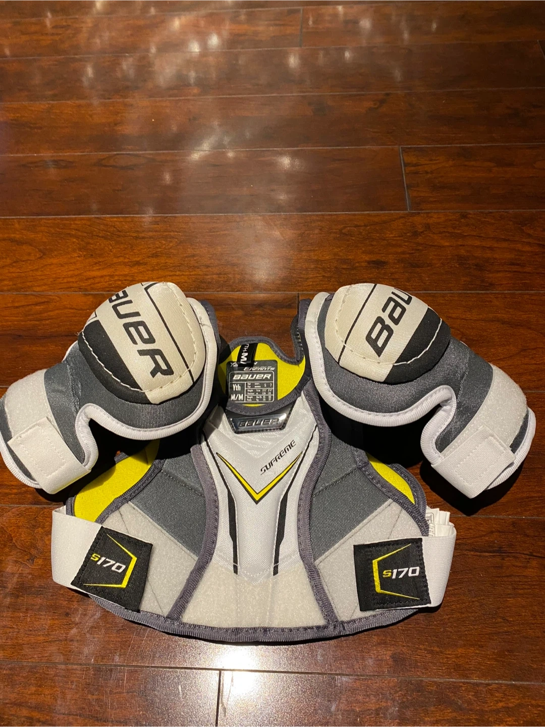 Selling a set of hockey protective gear including Bauer Supreme shin guards (9" / 23cm), Bauer S170 shoulder pads (M/M), and Winnwell gloves. All in good condition and ready for the rink!