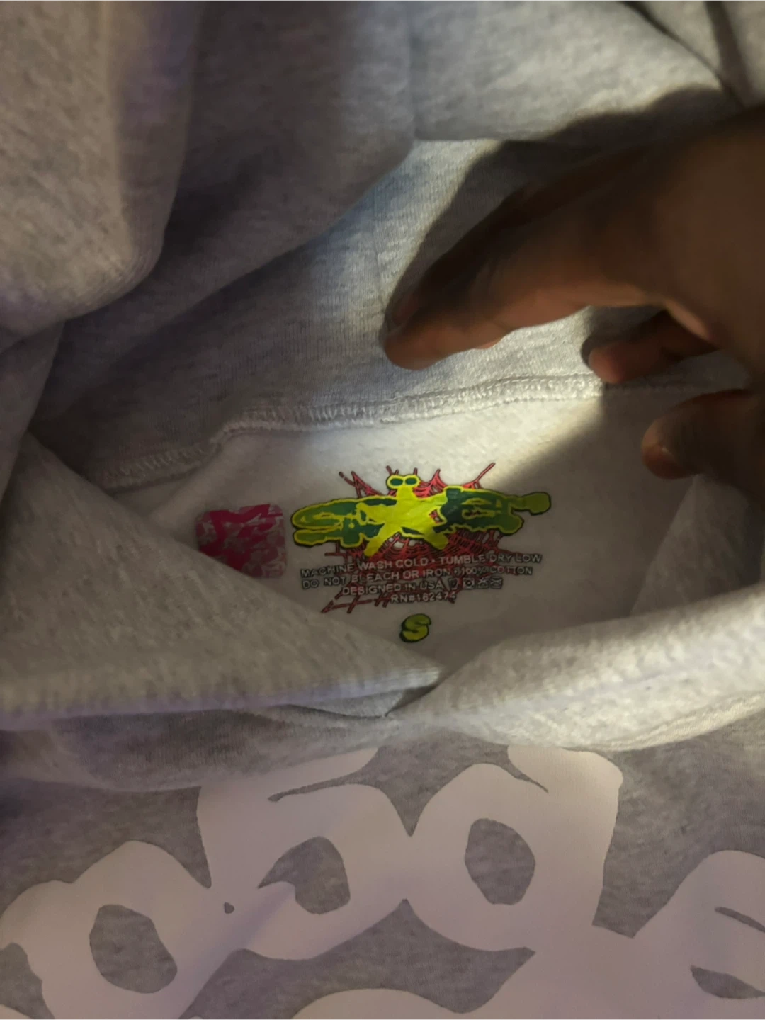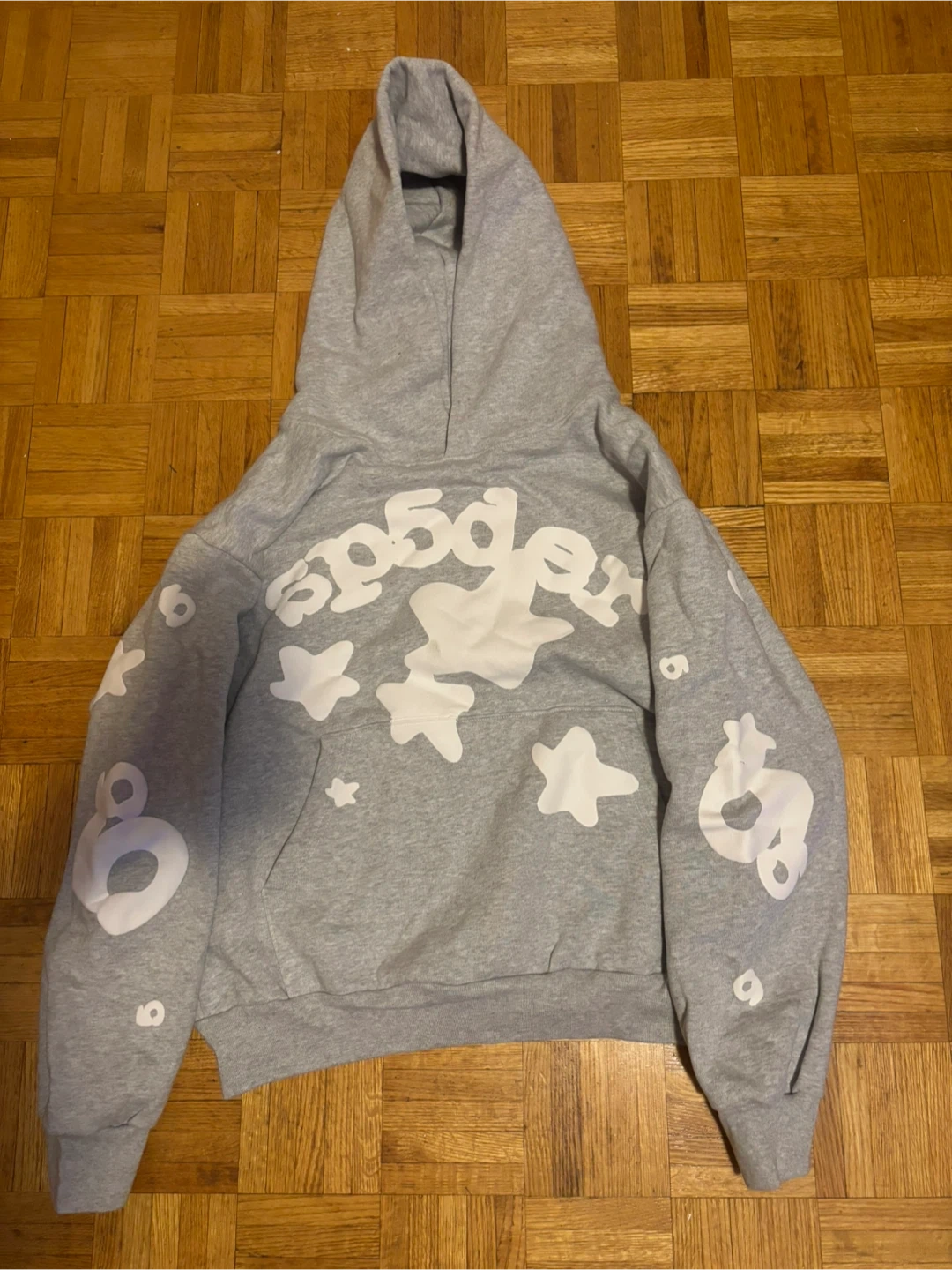 Selling a Sp5der hoodie in size small! It's a stylish and comfortable hoodie with a unique design. The hoodie is grey with white graphics. Perfect for casual wear!