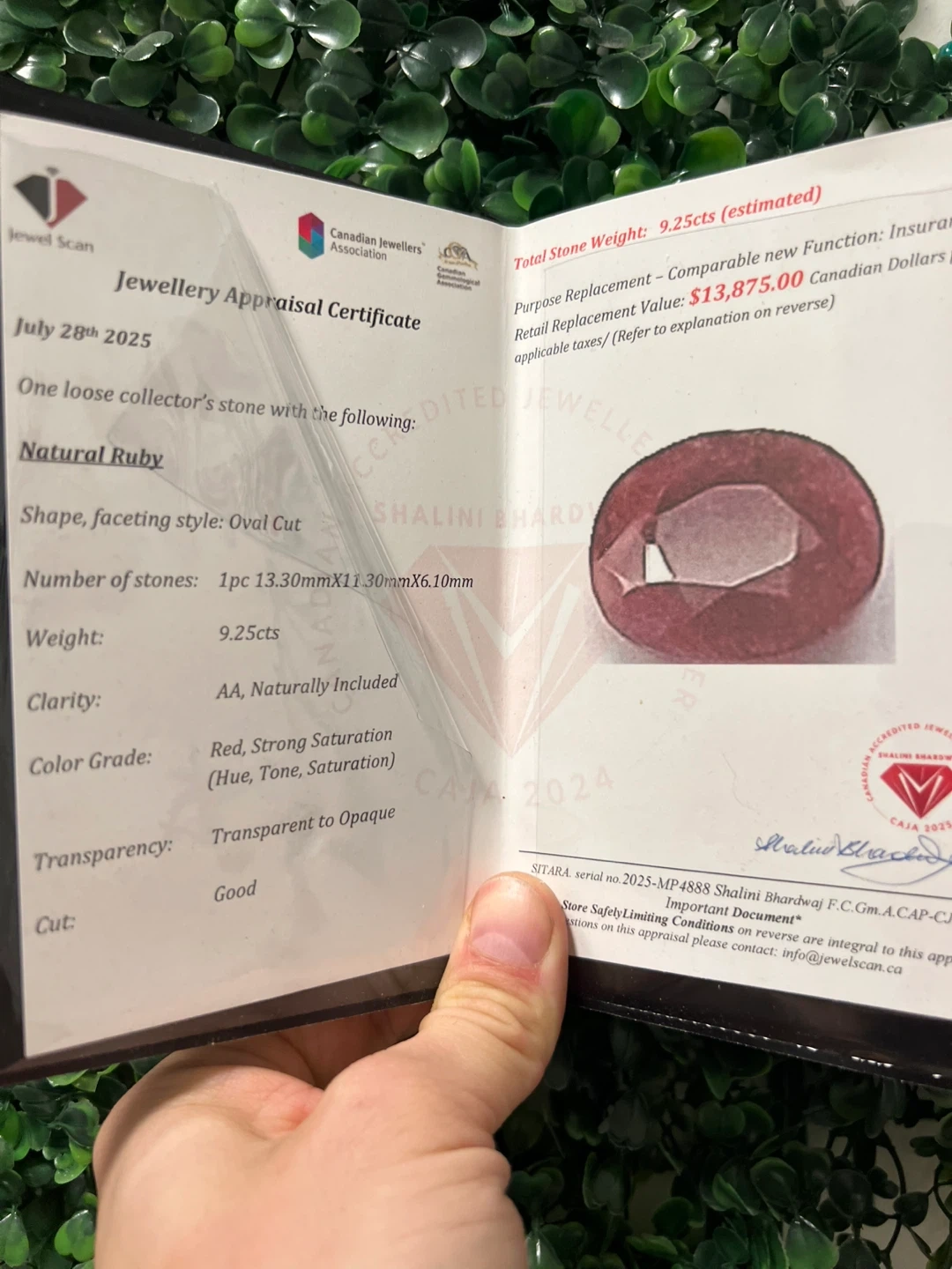 Selling a beautiful natural ruby ring. The stone is a loose collector's stone with an oval cut. It weighs 9.25cts (estimated). The stone measures 13.30mmx11.30mmx6.10mm. The clarity is AA, naturally included, with a red, strong saturation colour grade. The transparency is transparent to opaque, and the cut is good. This ring was appraised July 28th 2025 with a comparable function retail replacement value of $13,875.00 Canadian Dollars