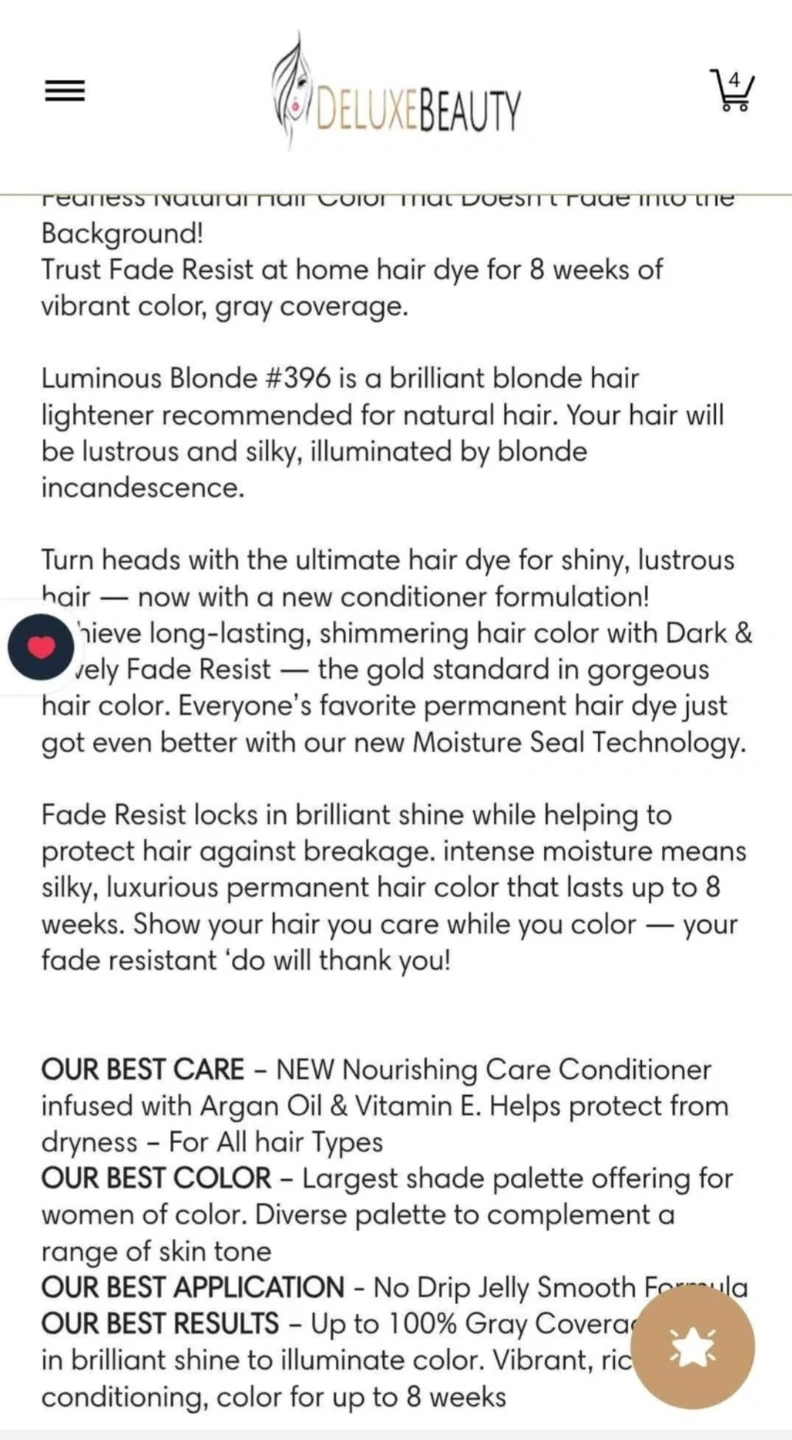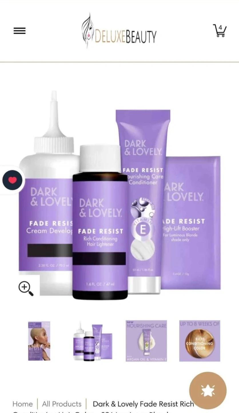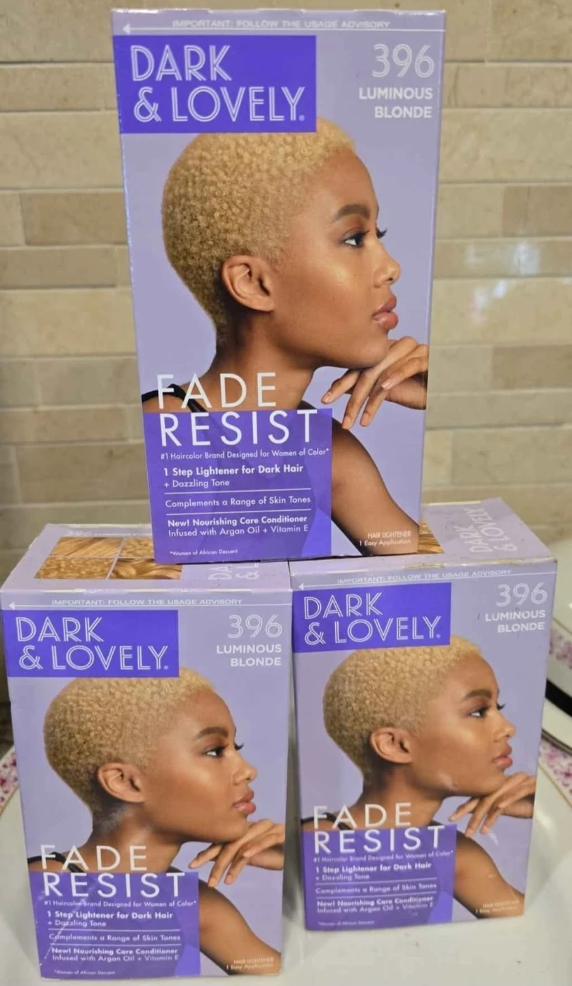 Selling Dark & Lovely Fade Resist in Luminous Blonde #396. This hair lightener is designed for dark hair and complements a range of skin tones. It includes a nourishing care conditioner infused with Argan Oil & Vitamin E for all hair types. It is recommended for natural hair and provides up to 8 weeks of vibrant colour and gray coverage