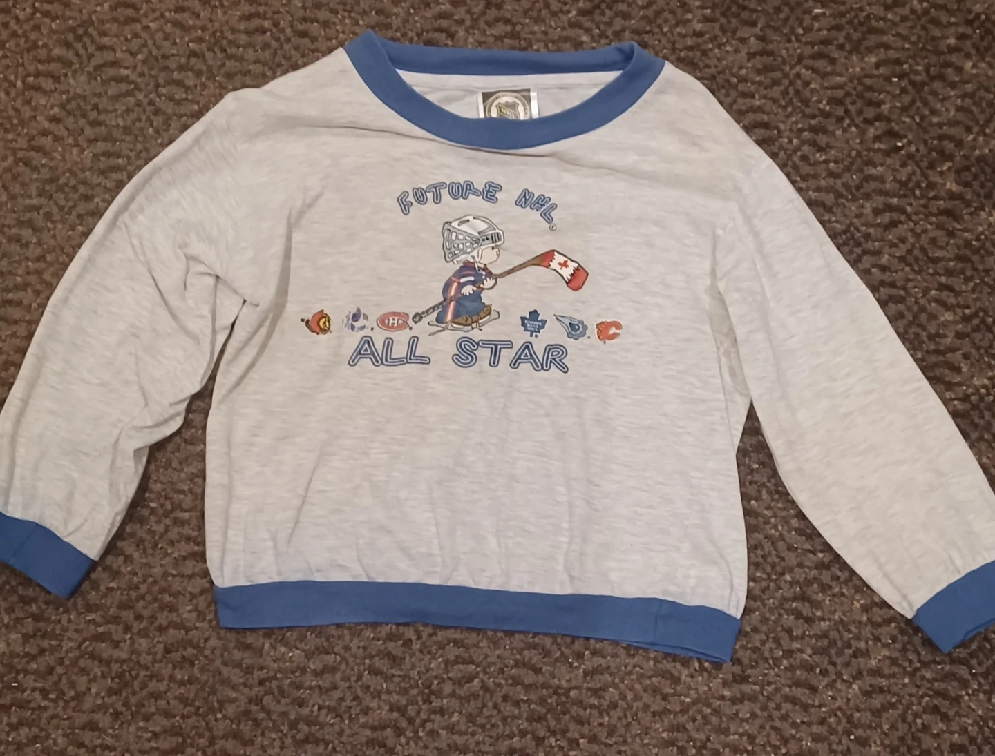 I'm selling a used NHL long-sleeve shirt, size 3X/3T. It features a fun 'Future NHL All-Star' design, perfect for your little hockey fan! The shirt is in fair condition, ready for more adventures