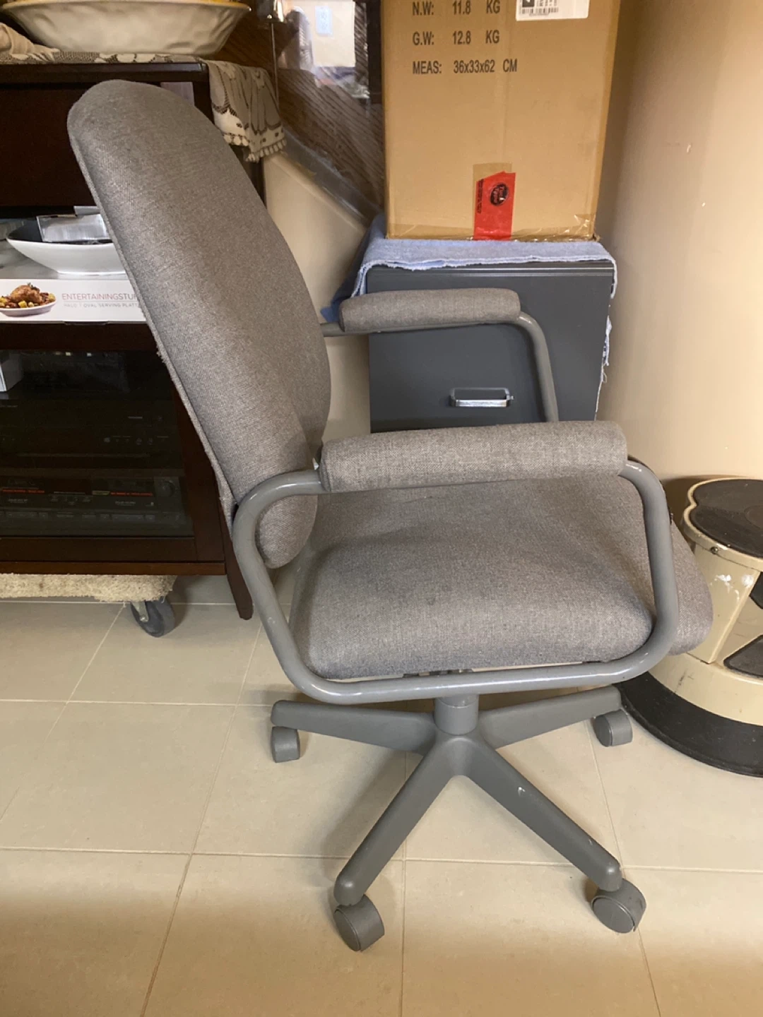 Selling a grey office chair! It's in good condition and ready for a new workspace. The chair is comfortable and has a sturdy base with wheels, making it easy to move around. Perfect for a home office or study area