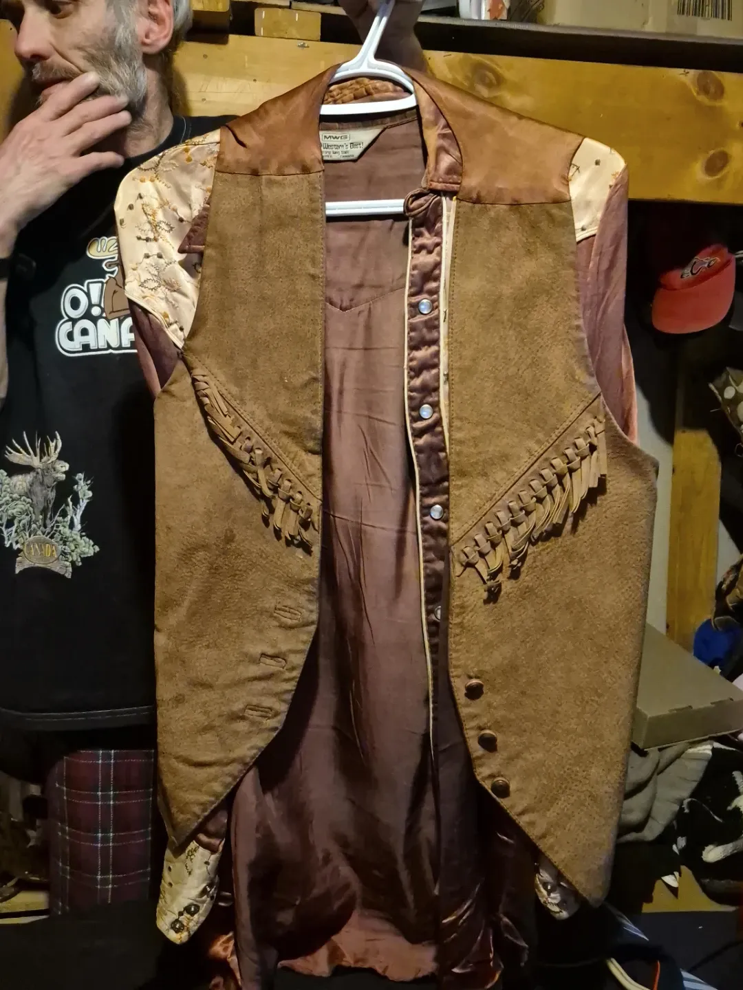 Here's a cool MWG Western Shirt vest! It's brown and made of suede, giving it that classic Western look. Perfect for adding a bit of flair to your outfit!