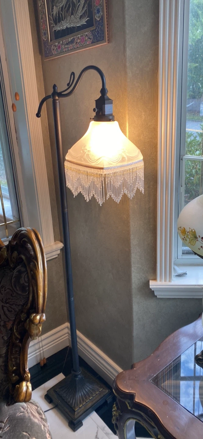 Selling a beautiful antique-style floor lamp. It has a unique fringed shade and a dark metal finish. It would be a lovely addition to any room!