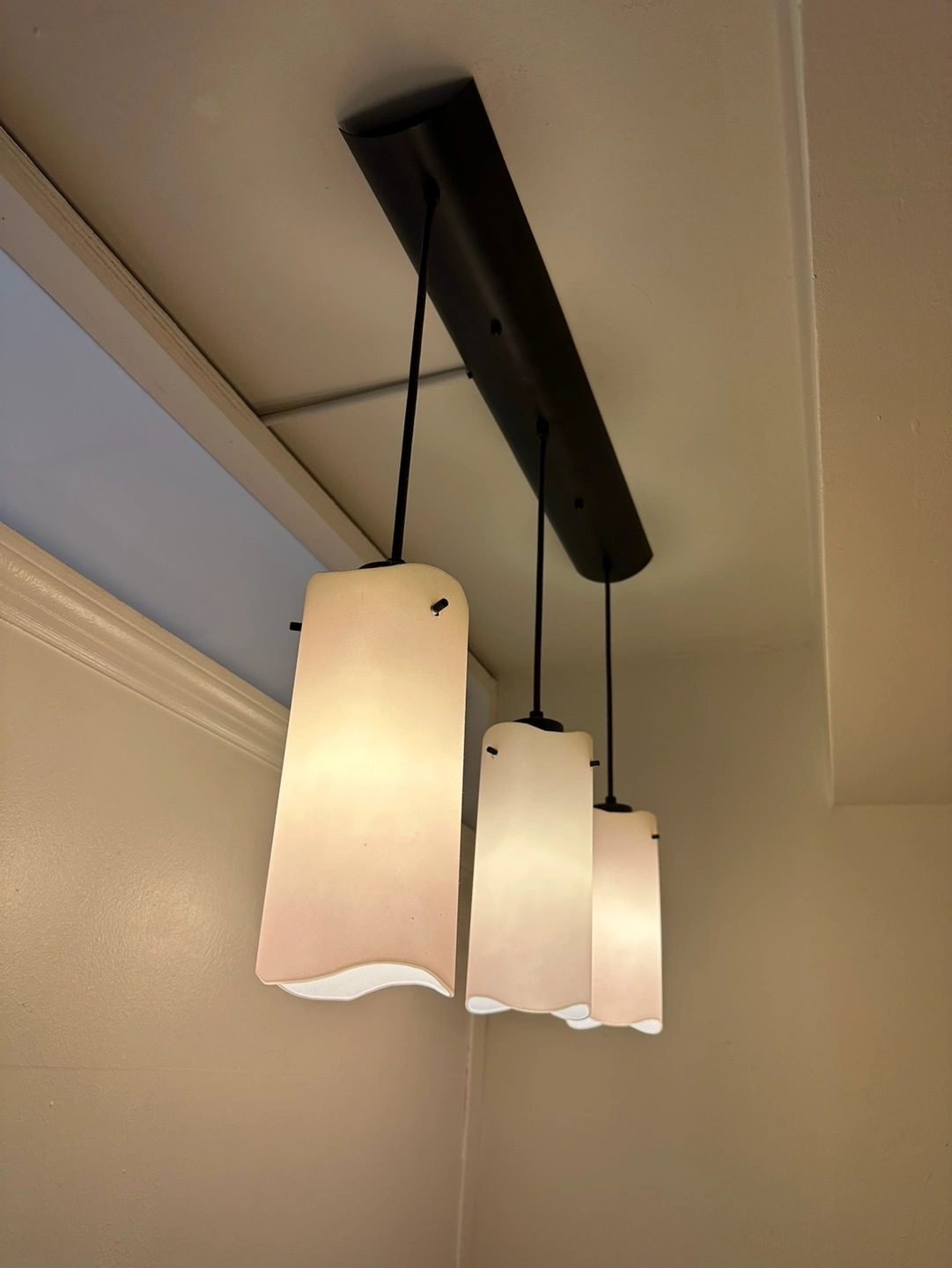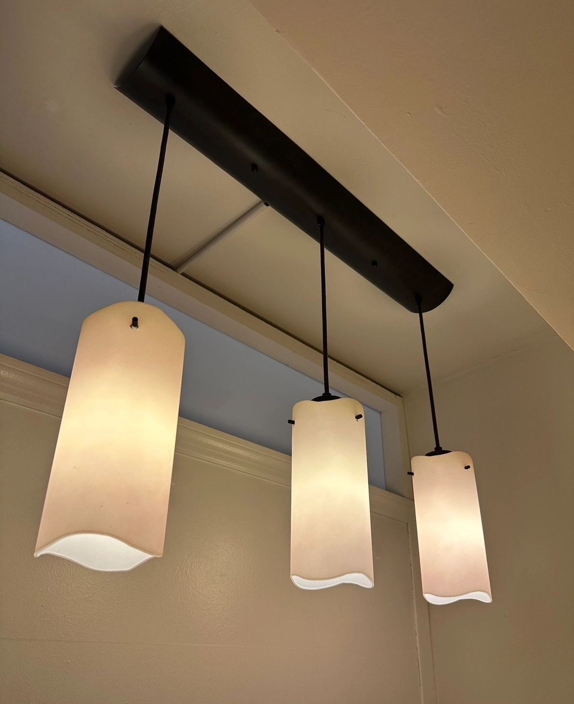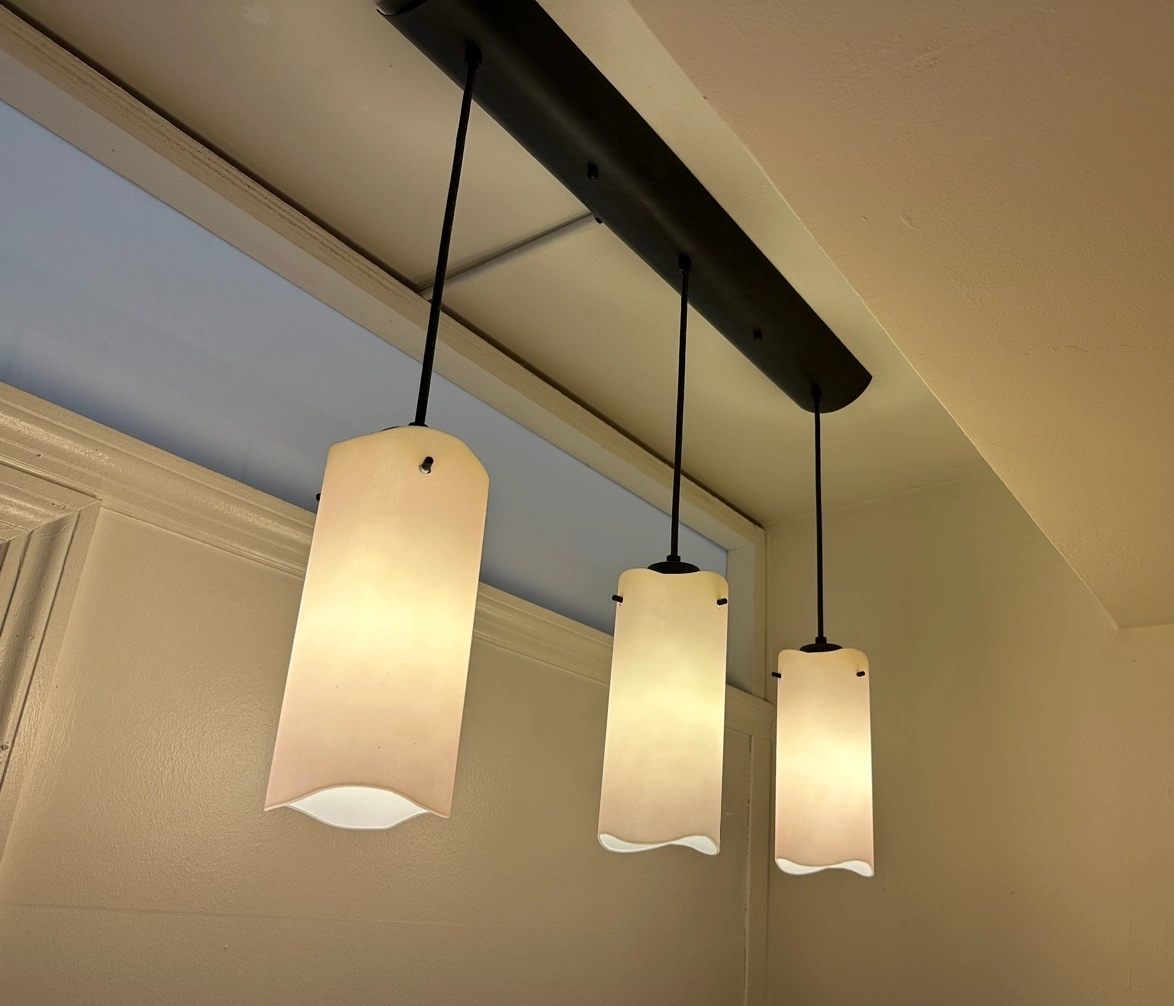 3-Light linear, contemporary glass pendant suspended with a 13.5" foot adjustable cord.