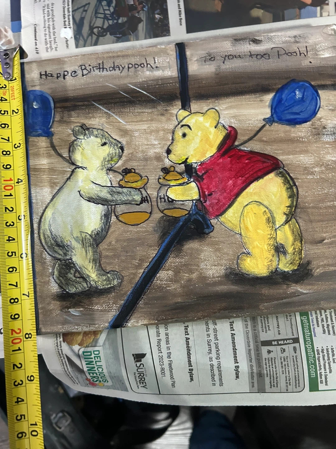 8inch x10inch acrylic painting of Winnie the Pooh saying happy birthday to Winnie the Pooh through a mirror. Sorry no refunds. Cash or e-transfer only. Payment to be made at pick up. Pick up