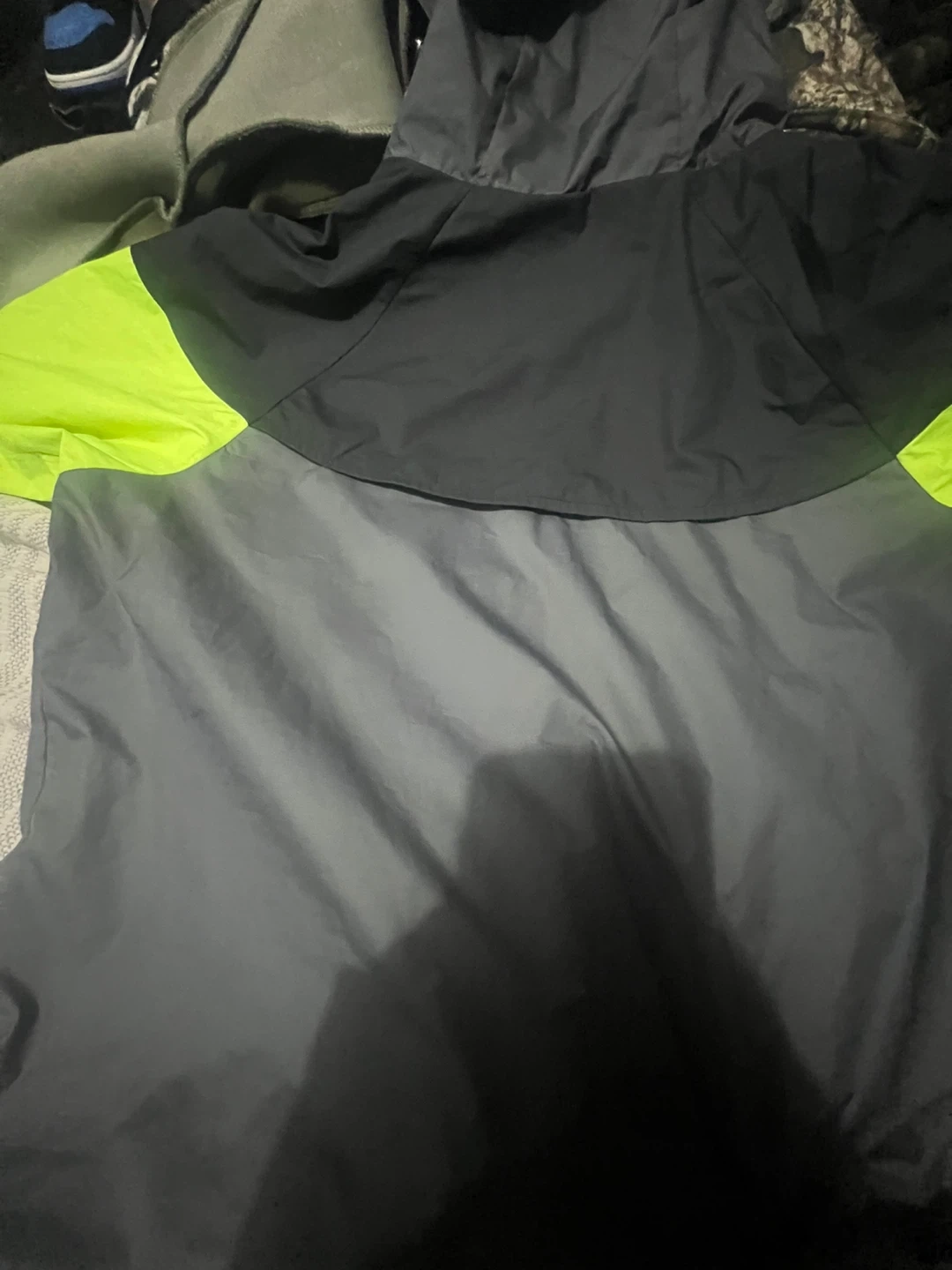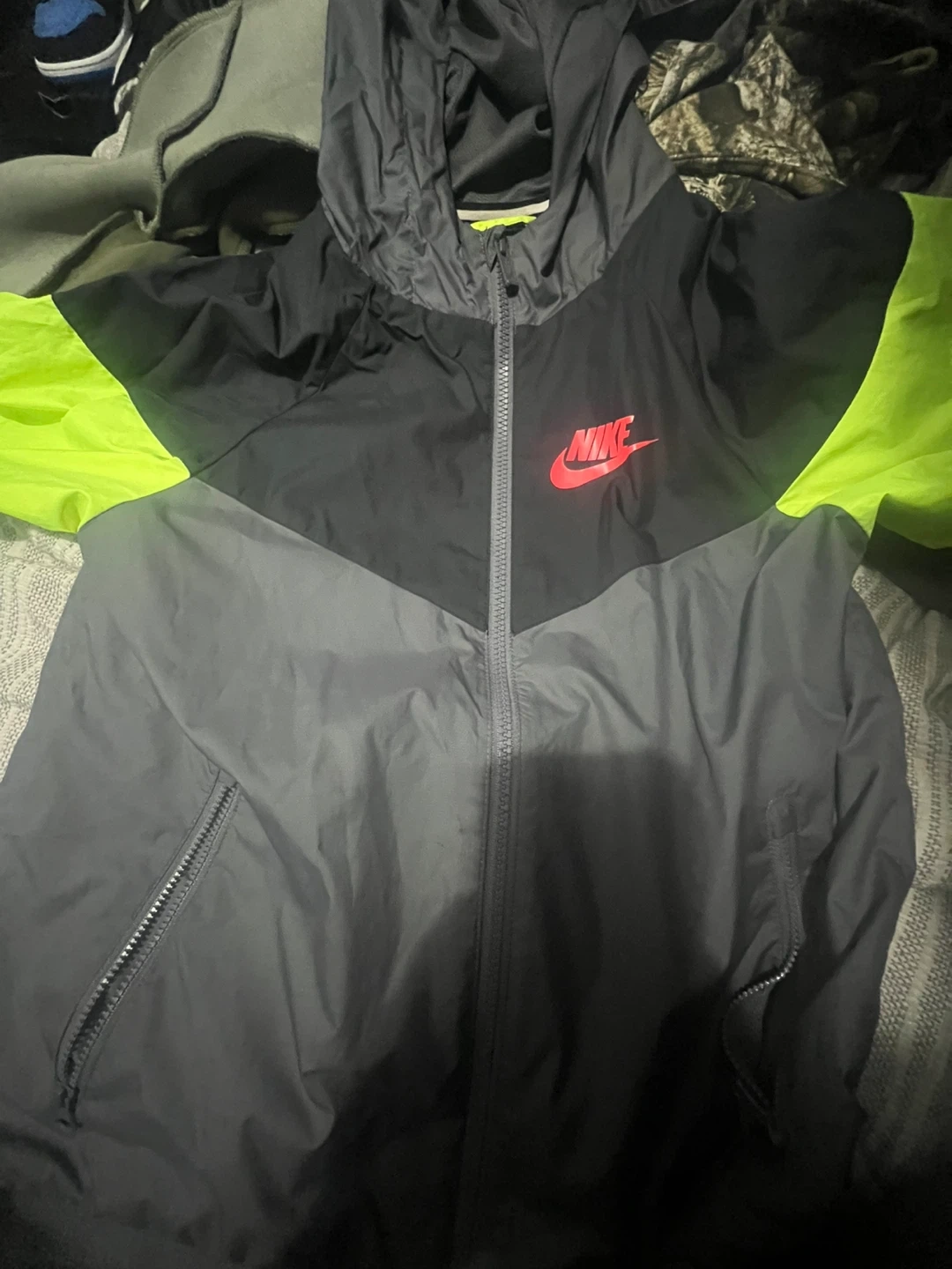 Selling a Nike Windrunner jacket in excellent condition! The jacket features a stylish colour block design with grey, black, and neon yellow accents. It has the classic Nike logo on the chest and is a size large. Perfect for running or everyday wear