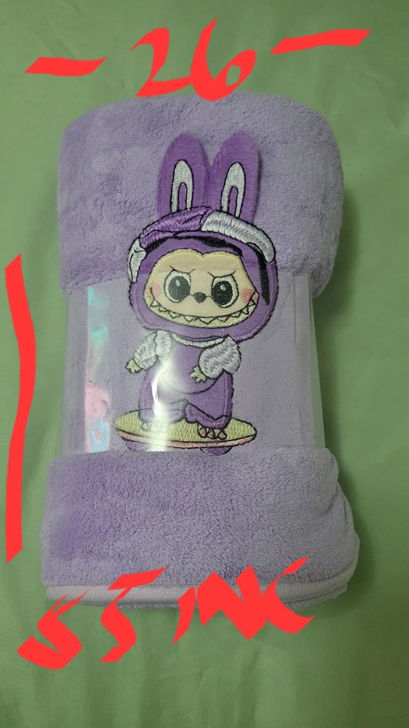 This is a cute purple plush towel featuring a cartoon Labubu character. It's still in its original packaging!