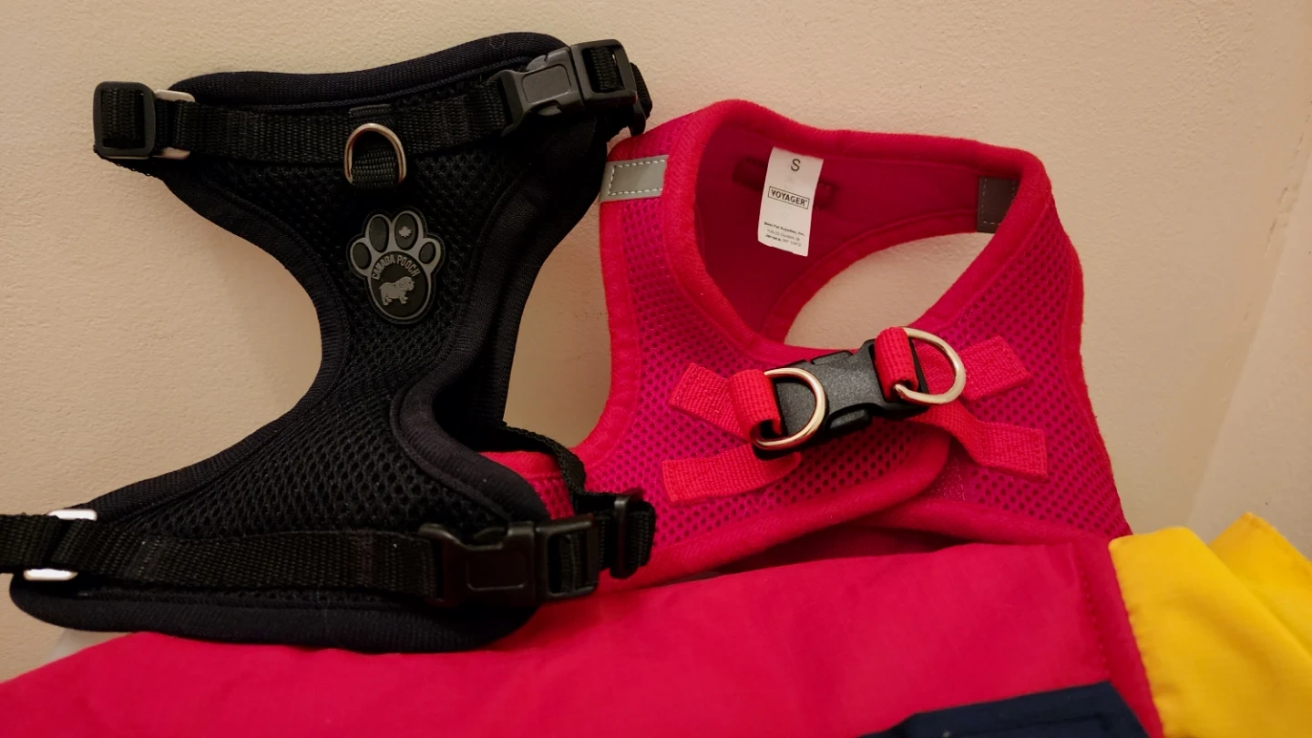 1-Two dog harnesses for sale! One is a Red Voyager harness, size small. The other is a black harness from Canada Pooch. Both are in great shape and ready for your furry friend!