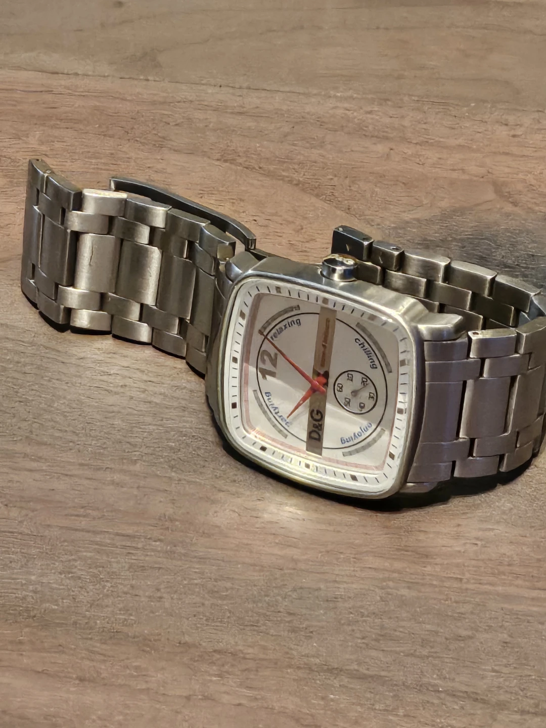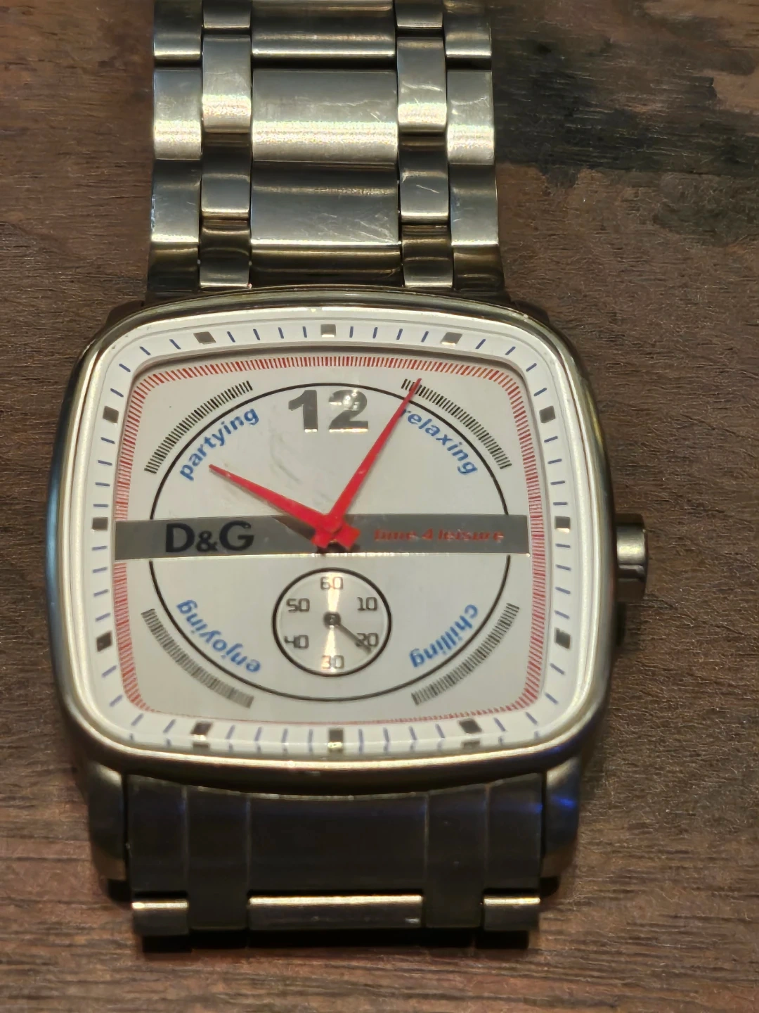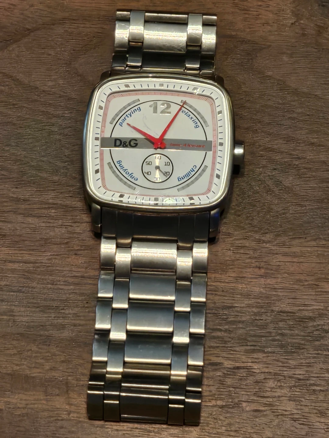 Selling a D&G Time 4 Leisure watch. It features a unique dial with words like 'partying,' 'relaxing,' 'enjoying,' and 'chilling' around the edge. The watch has a stainless steel band and a square face with red hands. It's a stylish and eye-catching piece!, there is a small scratch on the front glass. $75 OBO check out my other awesome collectibles im selling on here.