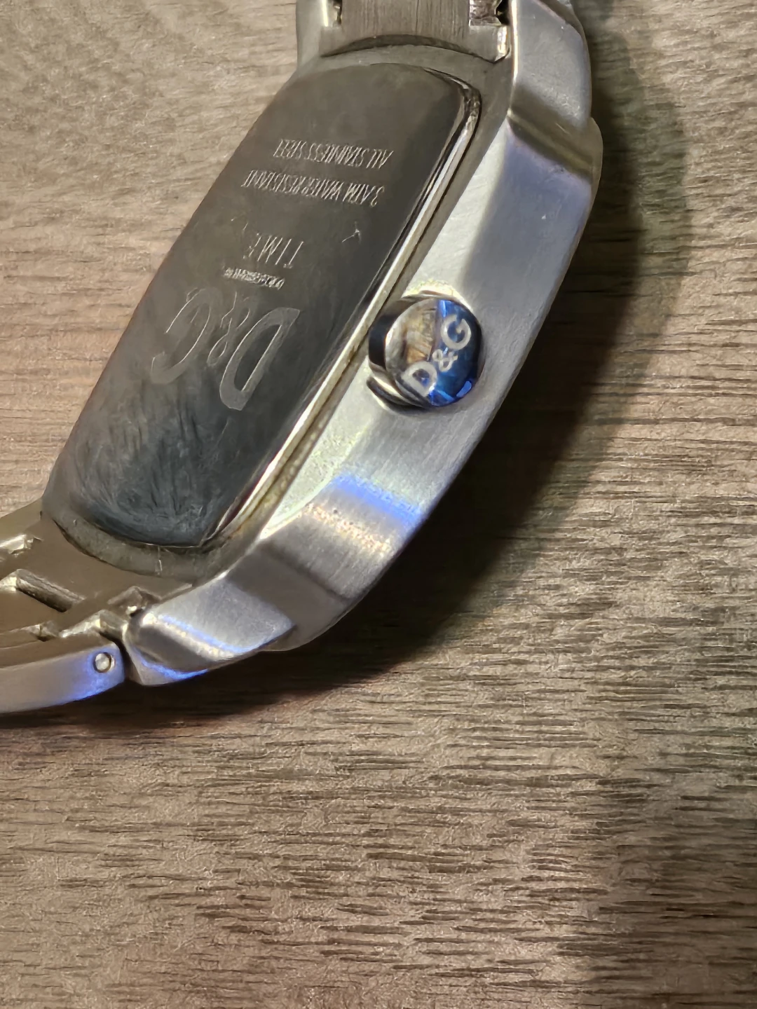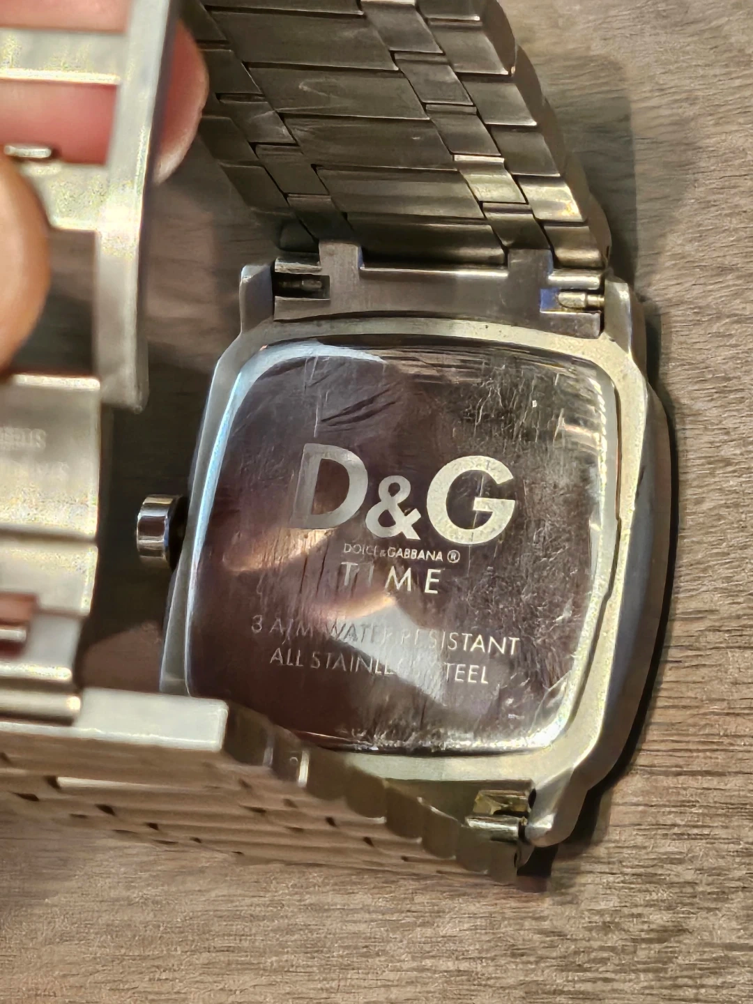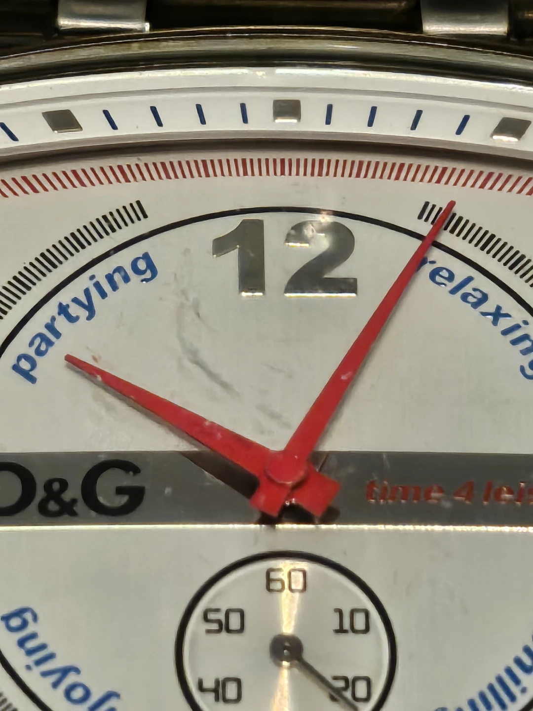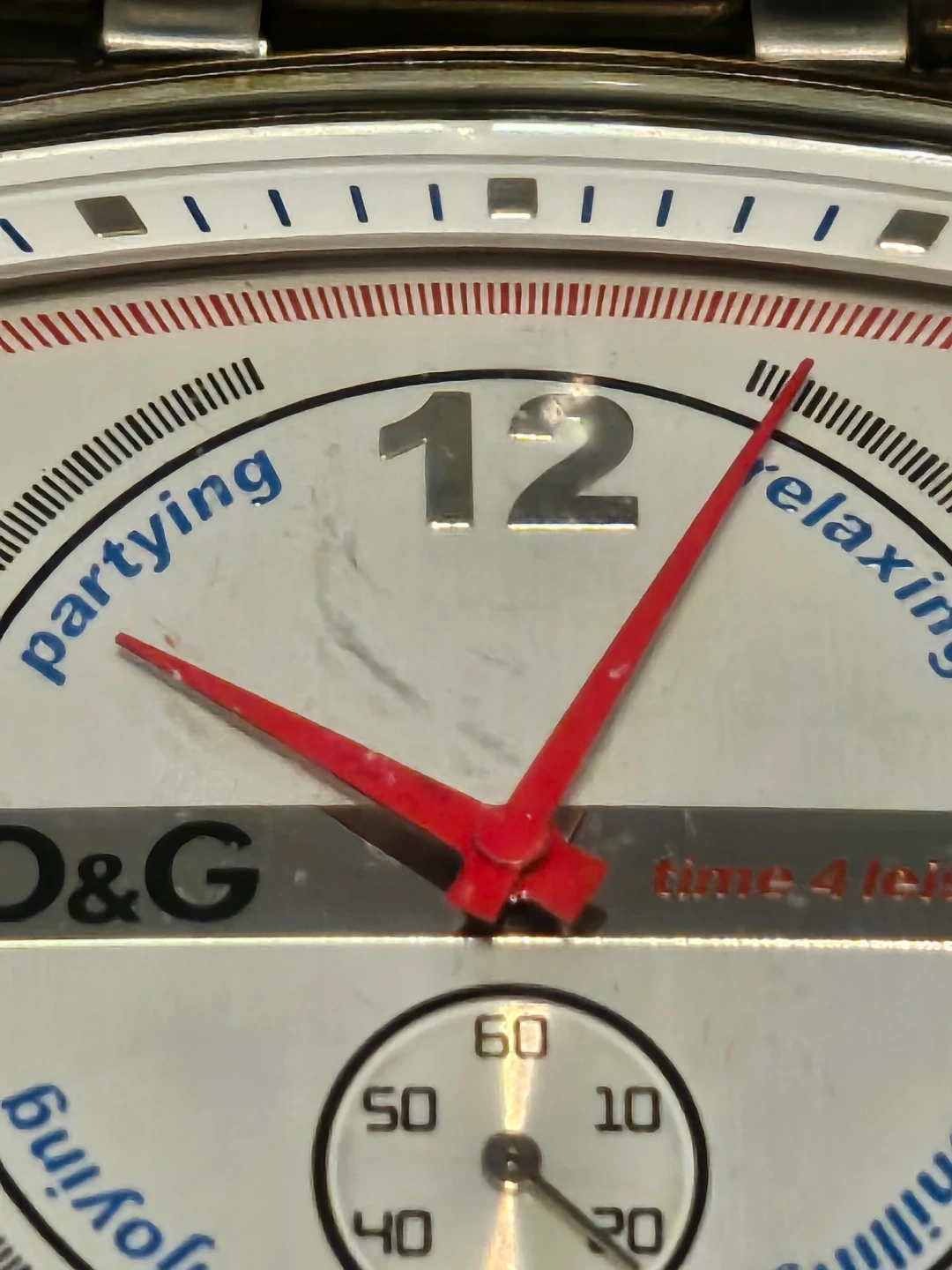 Selling a D&G Time 4 Leisure watch. It features a unique dial with words like 'partying,' 'relaxing,' 'enjoying,' and 'chilling' around the edge. The watch has a stainless steel band and a square face with red hands. It's a stylish and eye-catching piece!, there is a small scratch on the front glass. $75 OBO check out my other awesome collectibles im selling on here.