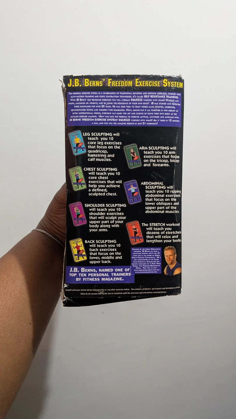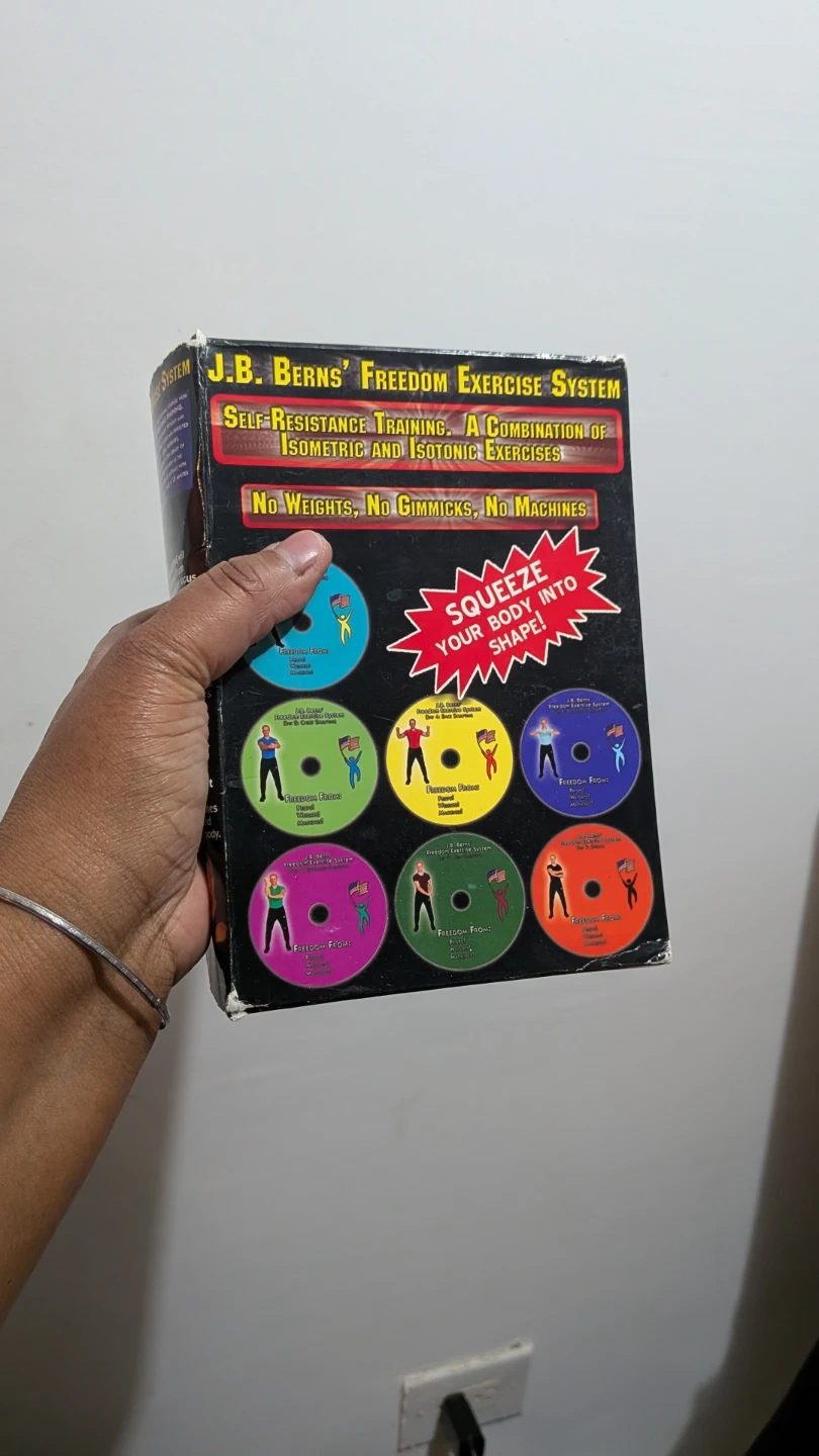 Selling a complete set of J.B. Berns' Freedom Exercise System. It's a combination of traditional isometric and isotonic exercises. The system includes DVDs for leg sculpting, arm sculpting, chest sculpting, abdominal sculpting, shoulder sculpting, back sculpting, and a stretch routine. Get ready to squeeze your body into shape!