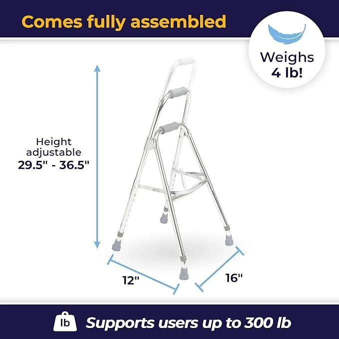 Selling a Drive Medical folding Hemi walker. It's lightweight, weighing only 4 lbs, and supports users up to 300 lbs. The height is adjustable from 29.5" to 36.5". Comes fully assembled and is easy to fold for storage and transport.