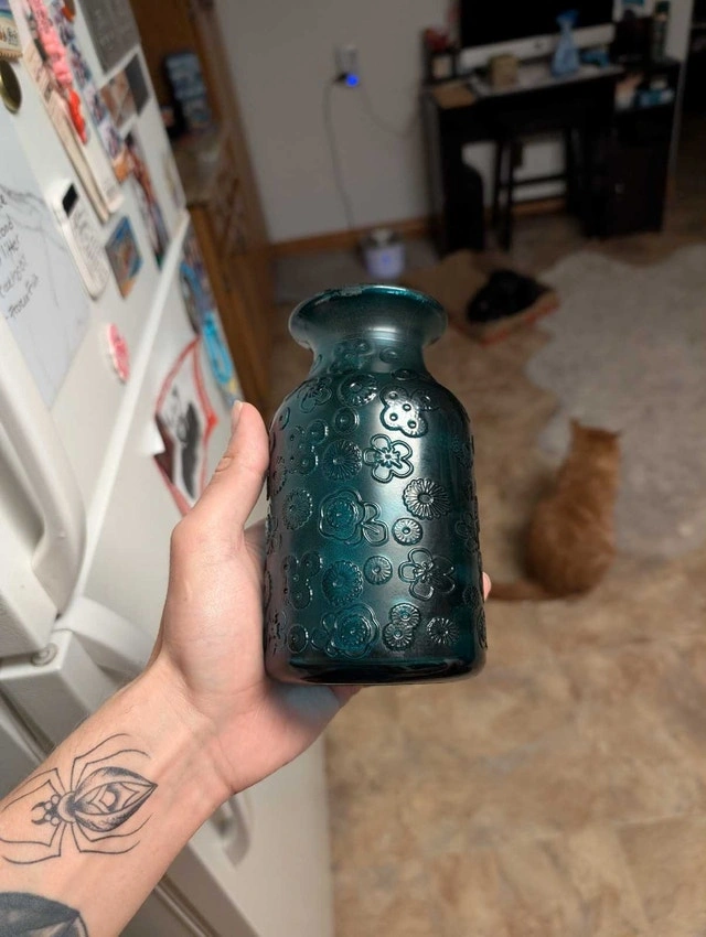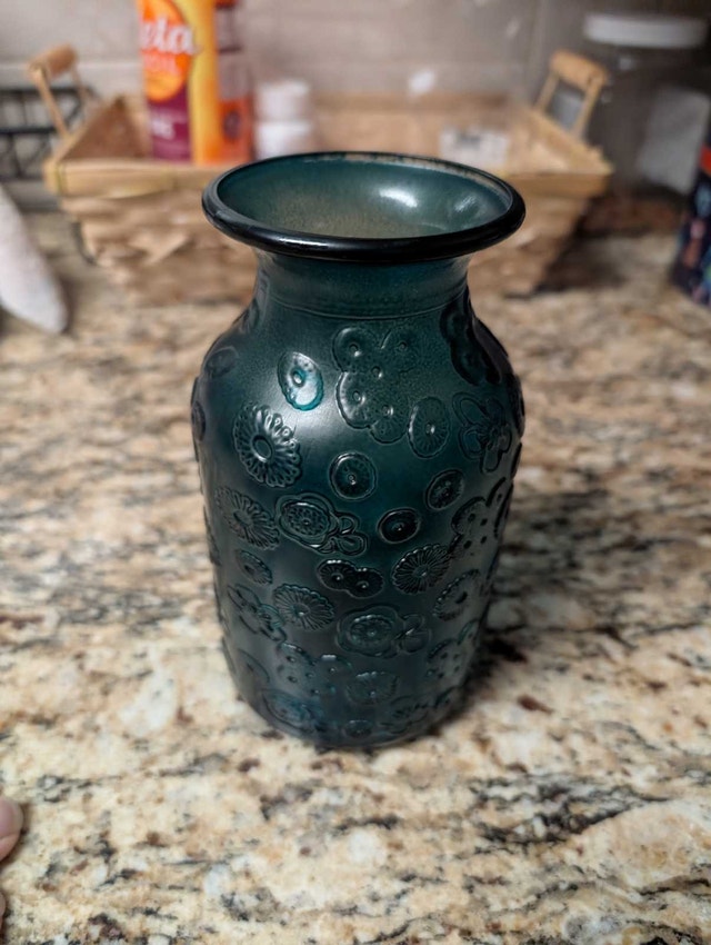 This elegant vase features a teal colour with floral detailing, making it a beautiful decorative piece for any home. It is in used, but good, condition. This item will add charm to your decor. If the ad is still up, it's still available!