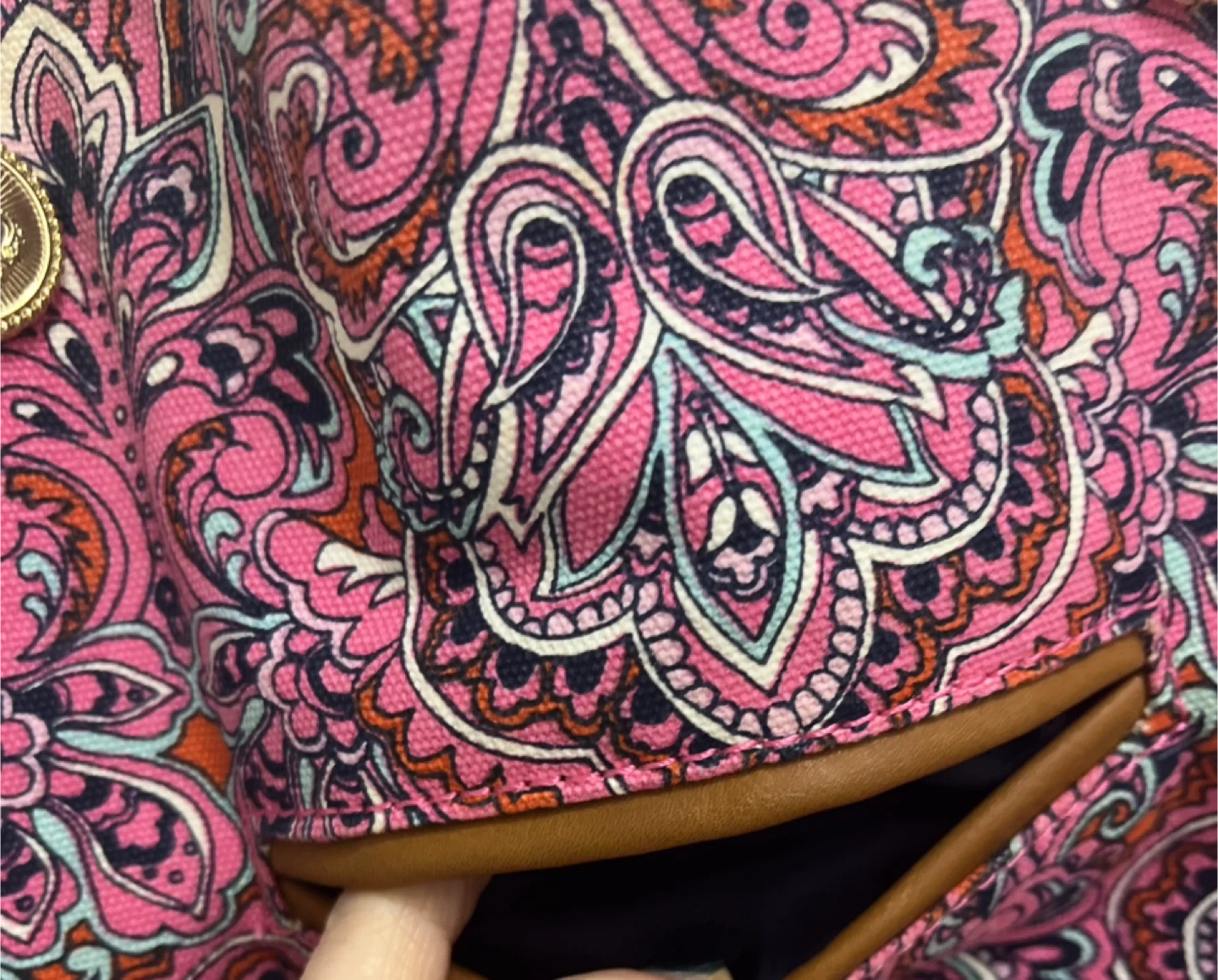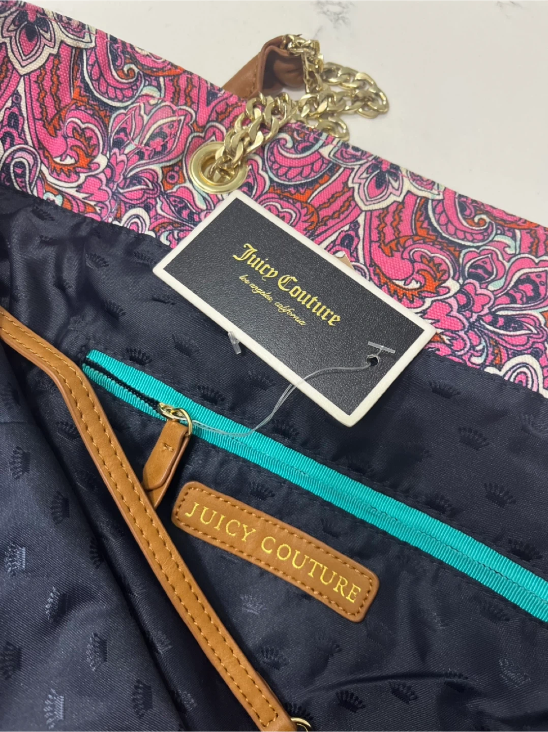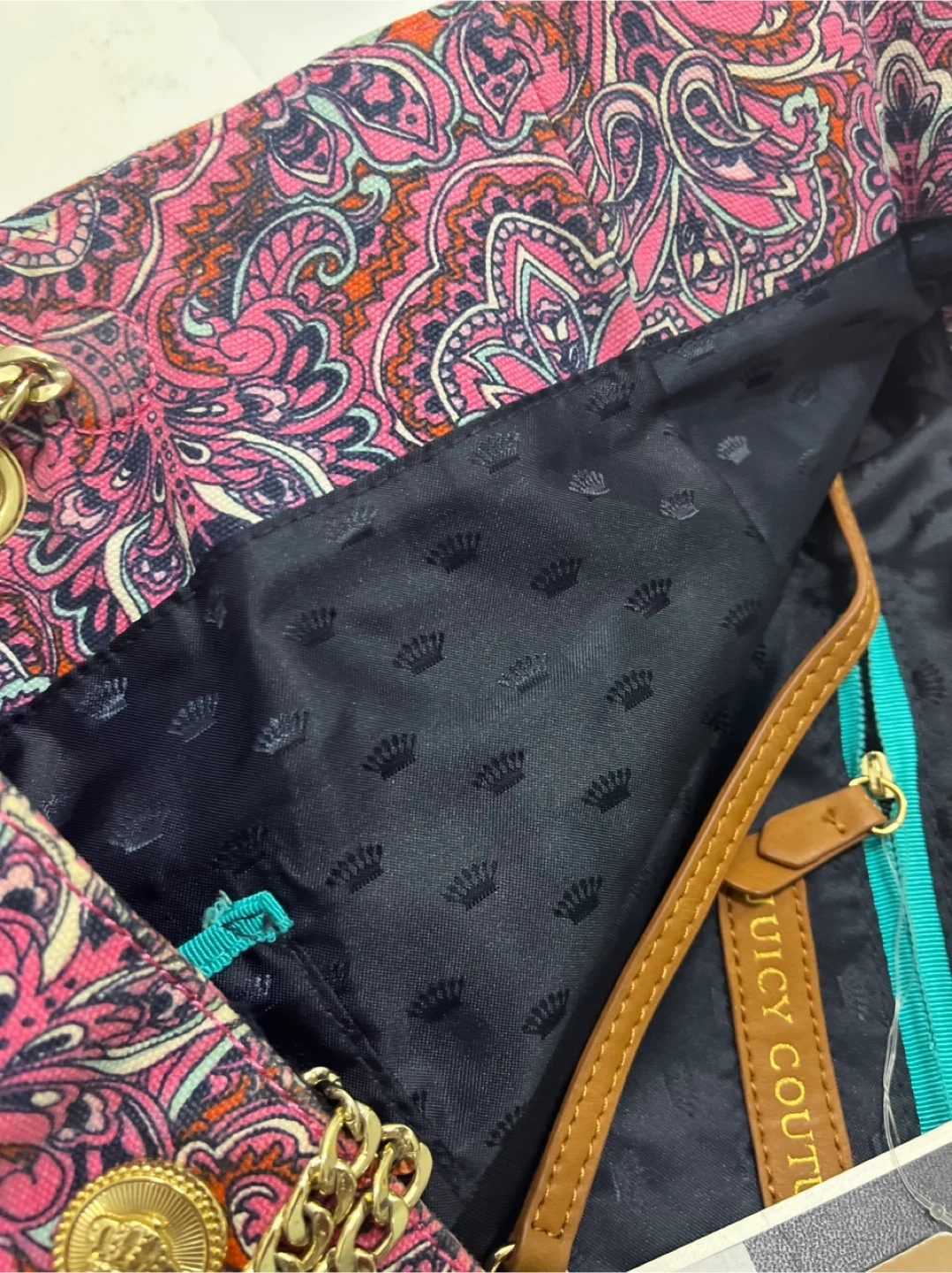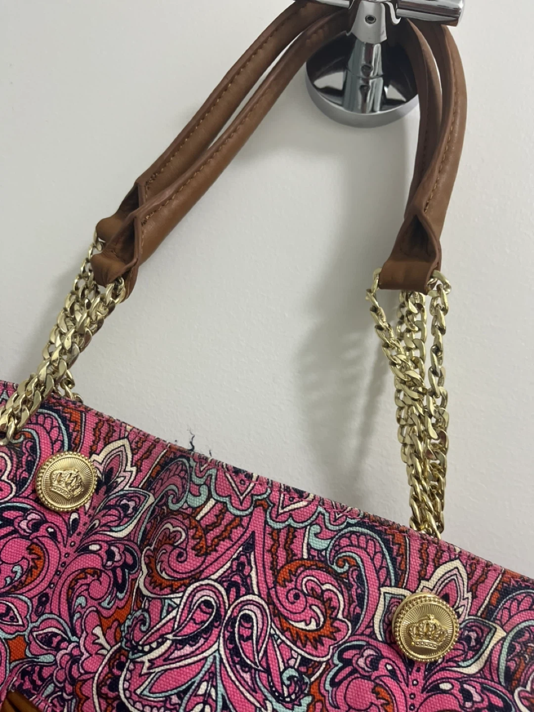 Juicy Couture tote bag with a colourful pink paisley design. It has gold chain details on the straps and brown leather accents.