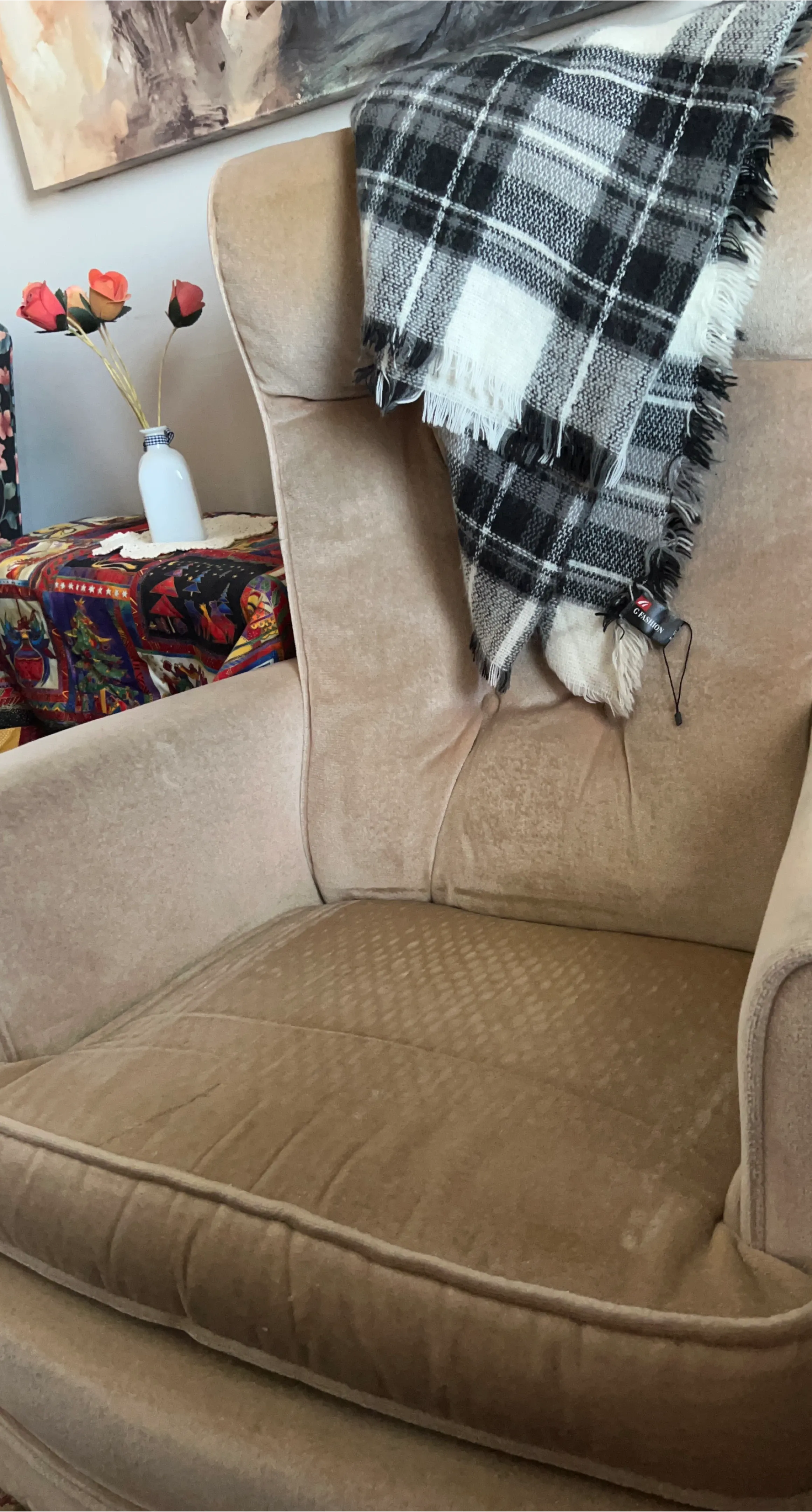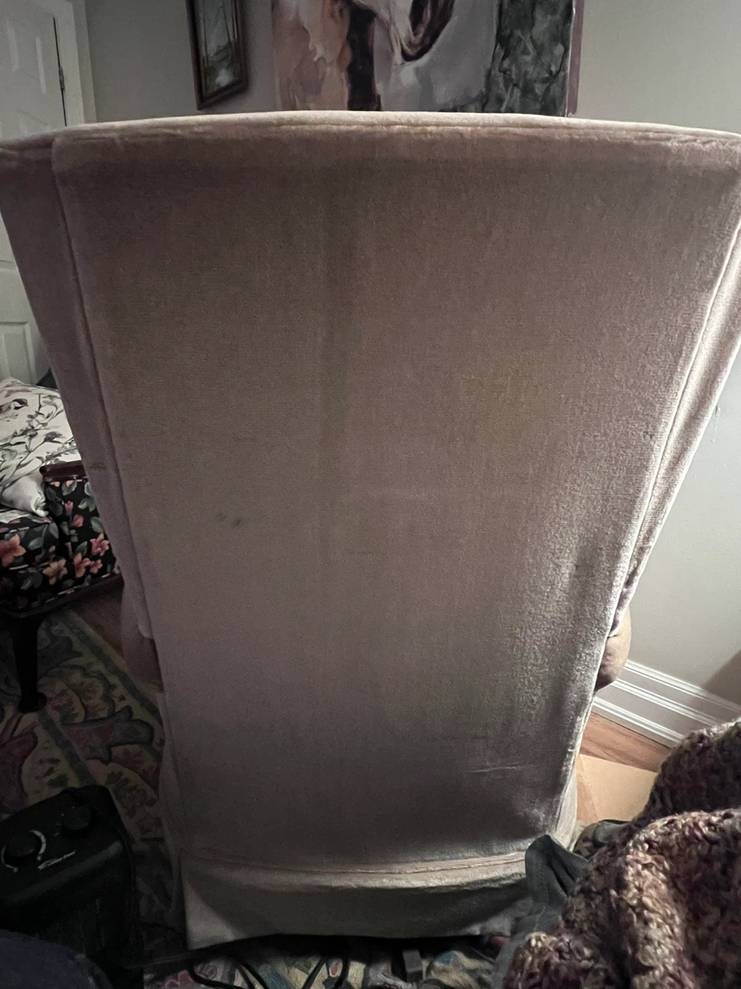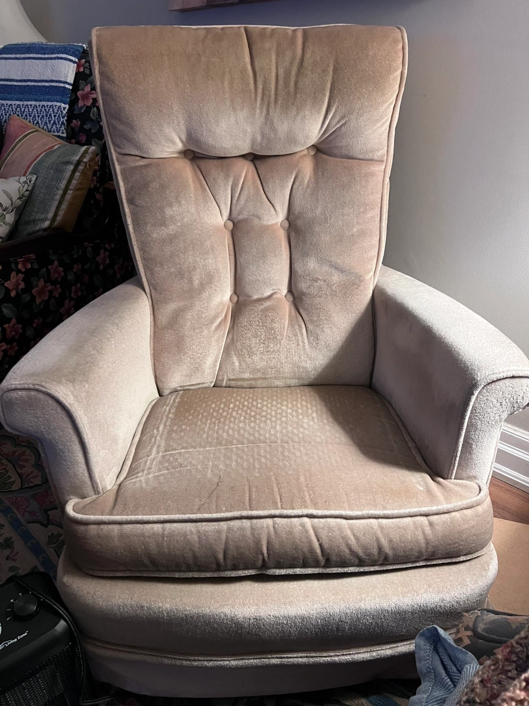 Selling a vintage wingback chair with a lovely beige velvet upholstery. It's a comfortable and stylish piece that would add a touch of elegance to any room. There are some signs of wear, but it's still in good condition and ready to be enjoyed!