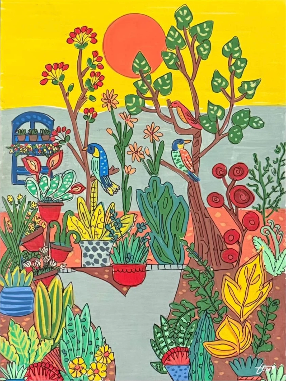 This is a vibrant and original painting featuring a colourful garden scene. It would be a lovely addition to any room!
