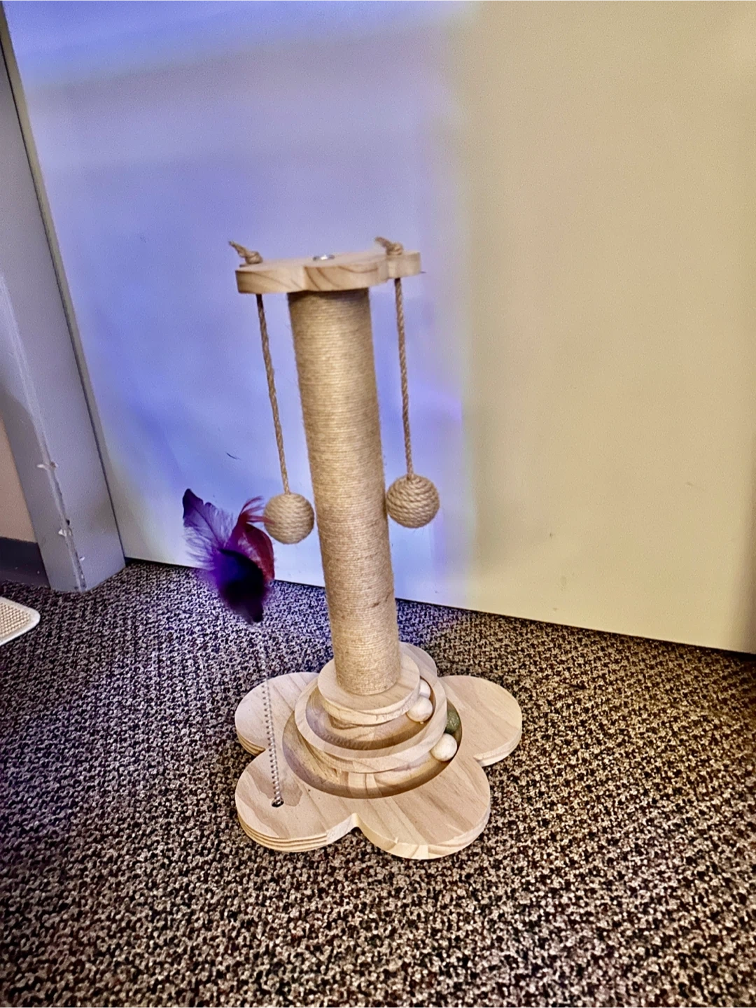 Sisal scratch post, 2 ball chase rings, and 2 hanging balls. 3 in 1 activities that can keep cats amused for hours—and take care of scratching needs as well. Never used by my cat. She’s been ignoring it since I got it for her.