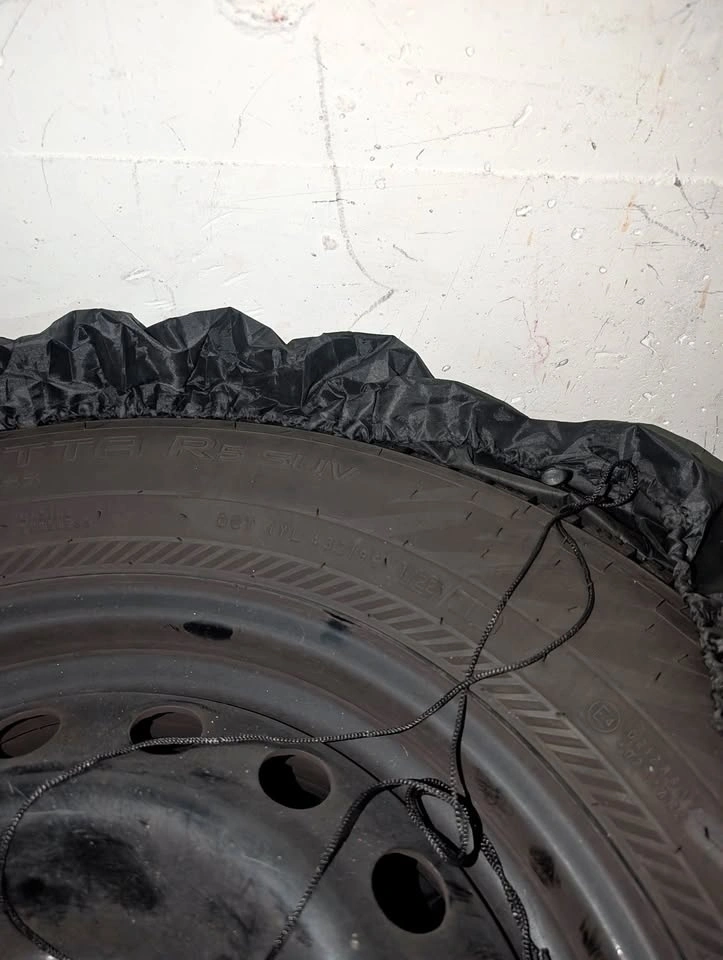The tires have been stored in protective tire totes in a climate-controlled environment to preserve the rubber compound.