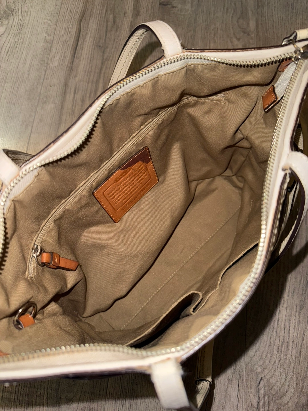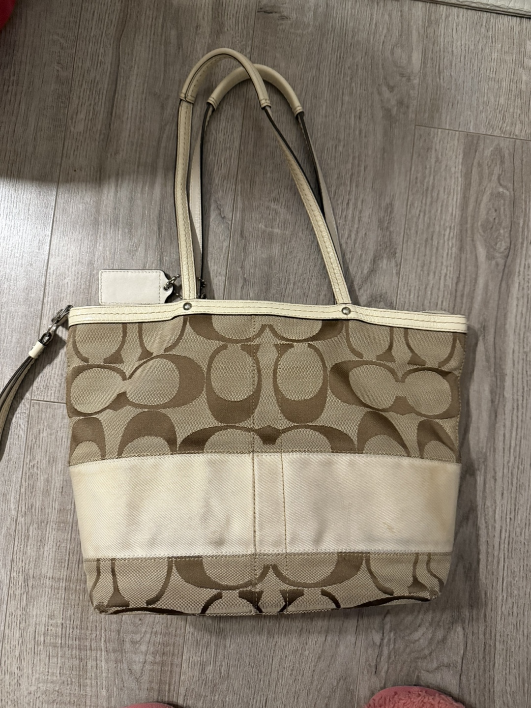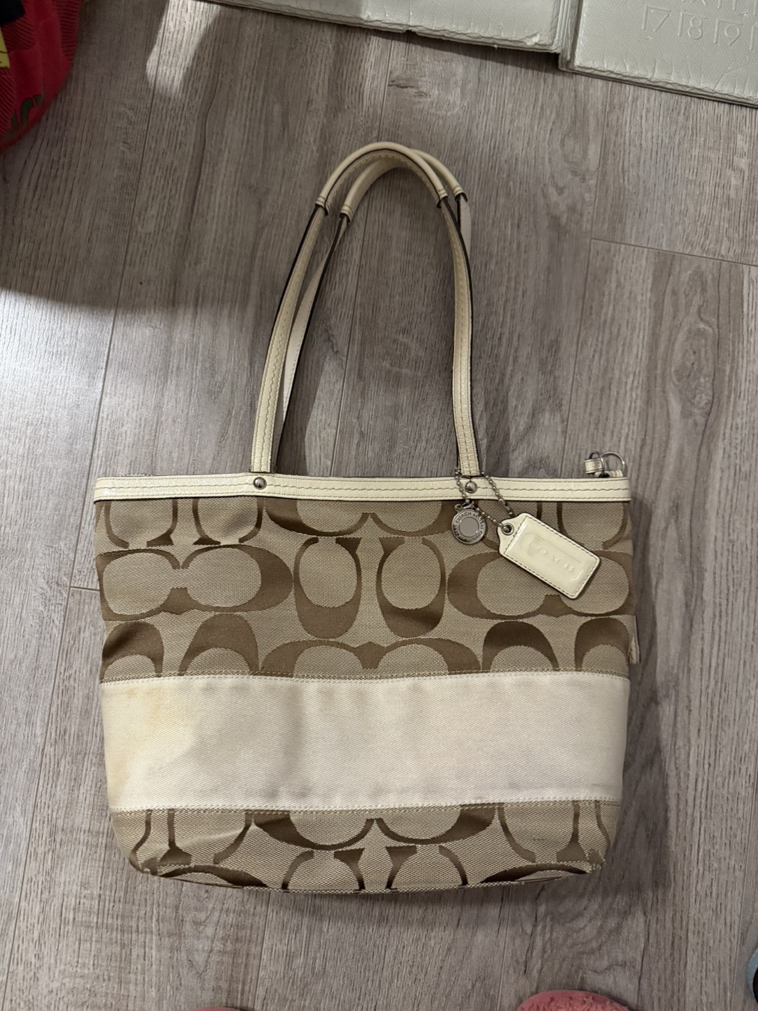 Selling a Coach tote bag with the signature canvas design. It's in good condition with some signs of wear, as shown in the photos. Great for everyday use! Stains on the white part outside of the bag, pick up by the Eaton Center $20