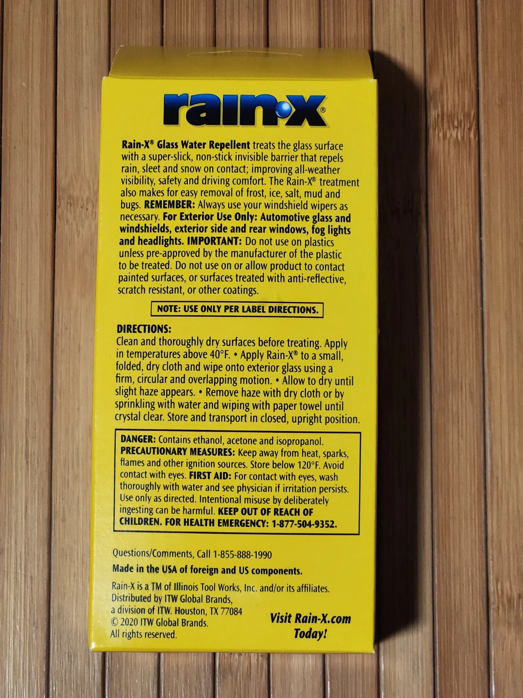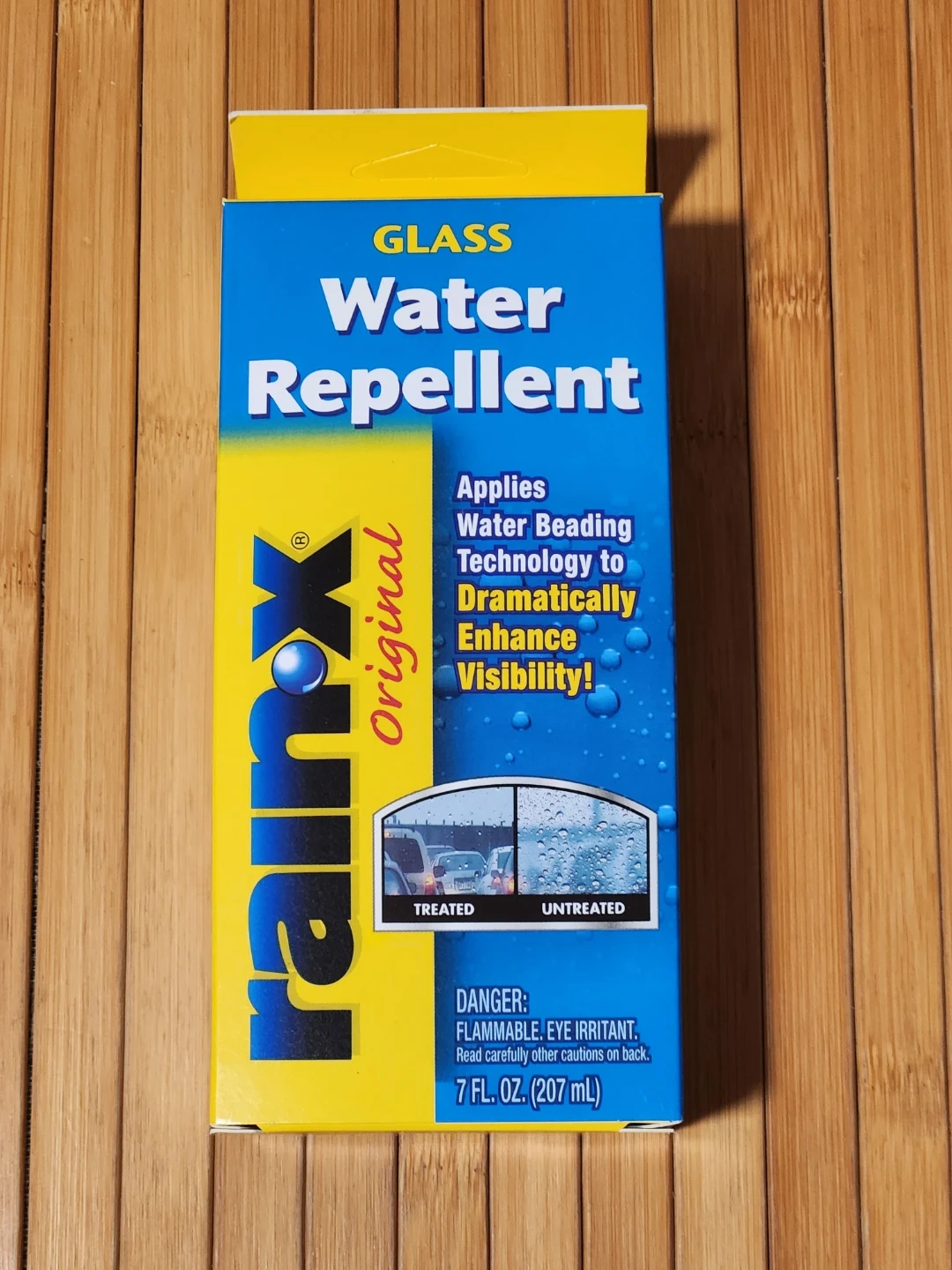 Selling a 7 fl oz bottle of Rain-X Glass Water Repellent. This product applies water beading technology to dramatically enhance visibility, improving all-weather visibility, safety and driving comfort. It treats the glass surface with a super-slick, non-stick invisible barrier that repels rain, sleet and snow on contact