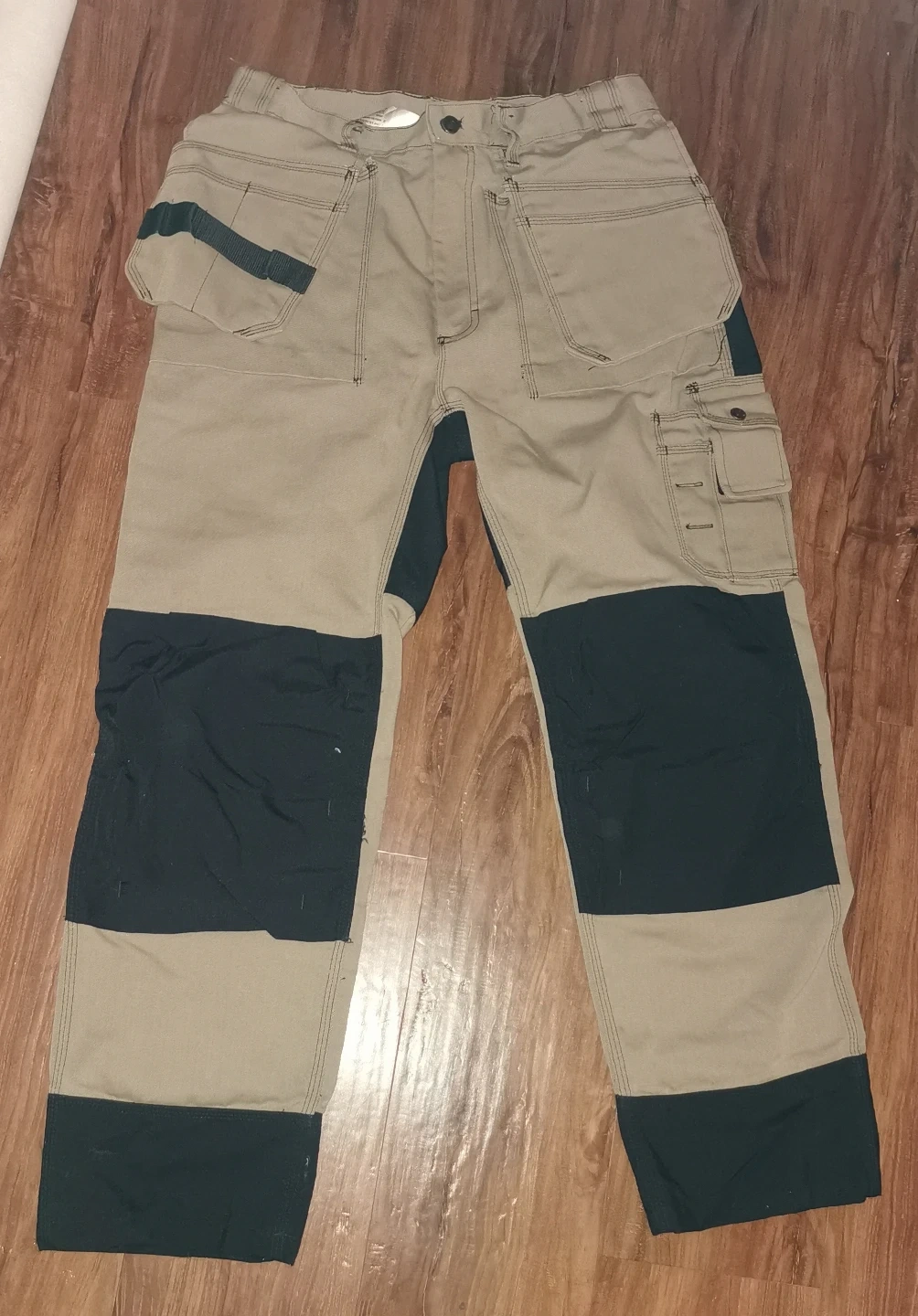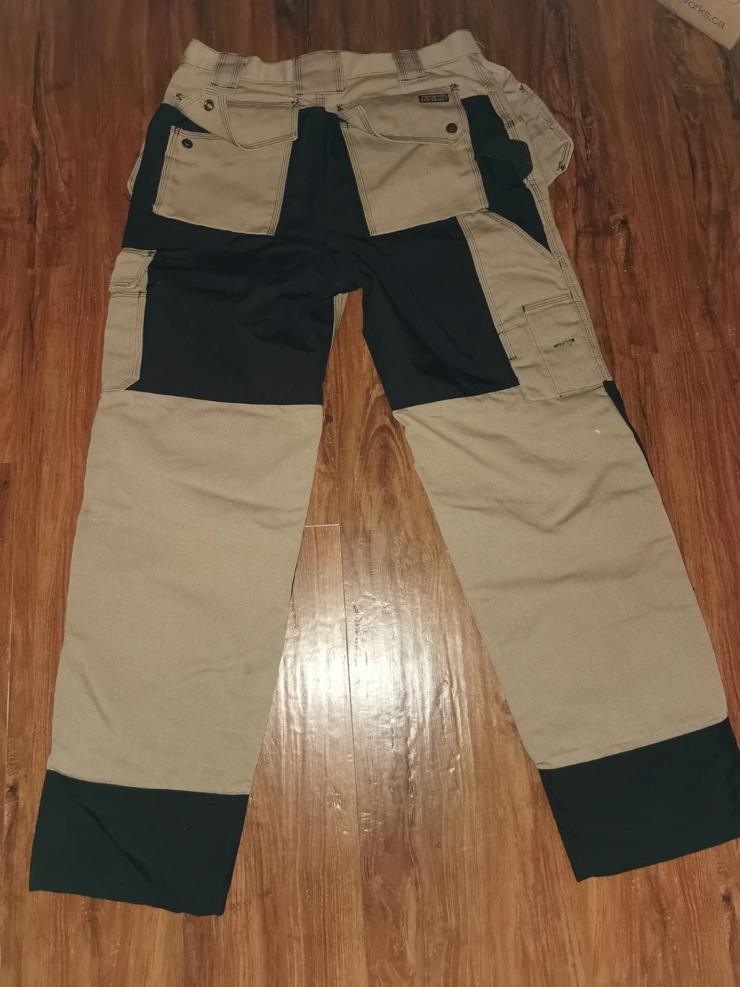 Selling a pair of Blaklader workwear pants in size 32/30. They're in great condition and ready for any job site! The pants feature a khaki and dark green colour block design, perfect for blending style with practicality.