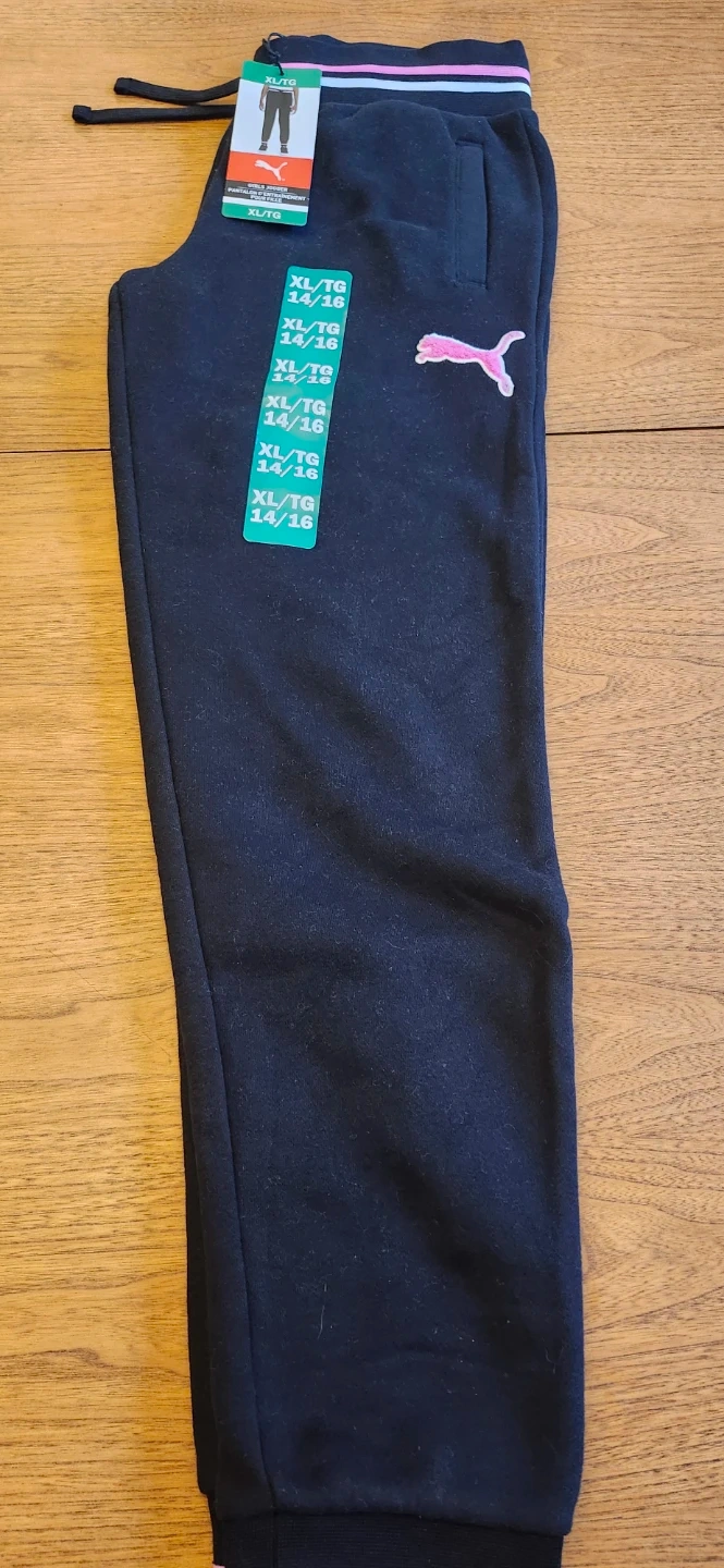 Girls' Puma jogger pants in size XL (14/16). These stylish and comfy pants are perfect for everyday wear or sports activities. They feature a pink Puma logo and are in brand new condition!