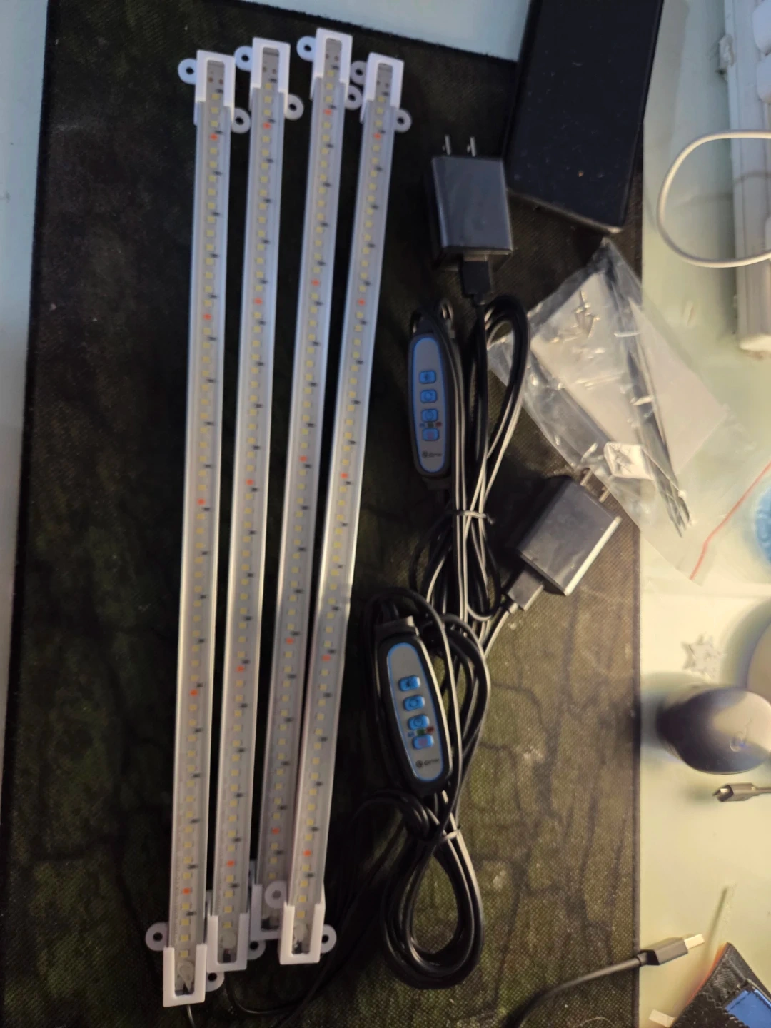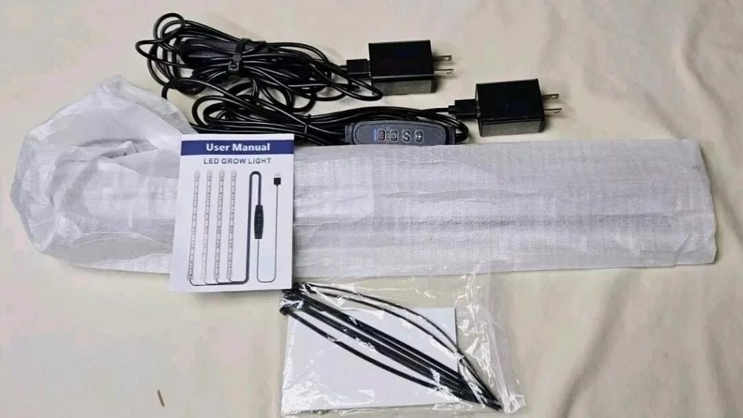 Selling a set of LED grow lights that are full spectrum and have an auto on/off feature. The set includes the user manual, power adapters, and mounting accessories to get you started right away. Perfect for indoor plants and seedlings!