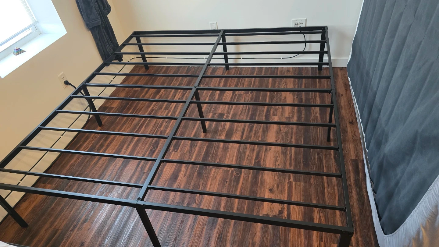 Selling a sturdy metal king size bed frame in black. No box spring needed. 18 inches tall for under storage. Must go immediately. Its already disassembled.