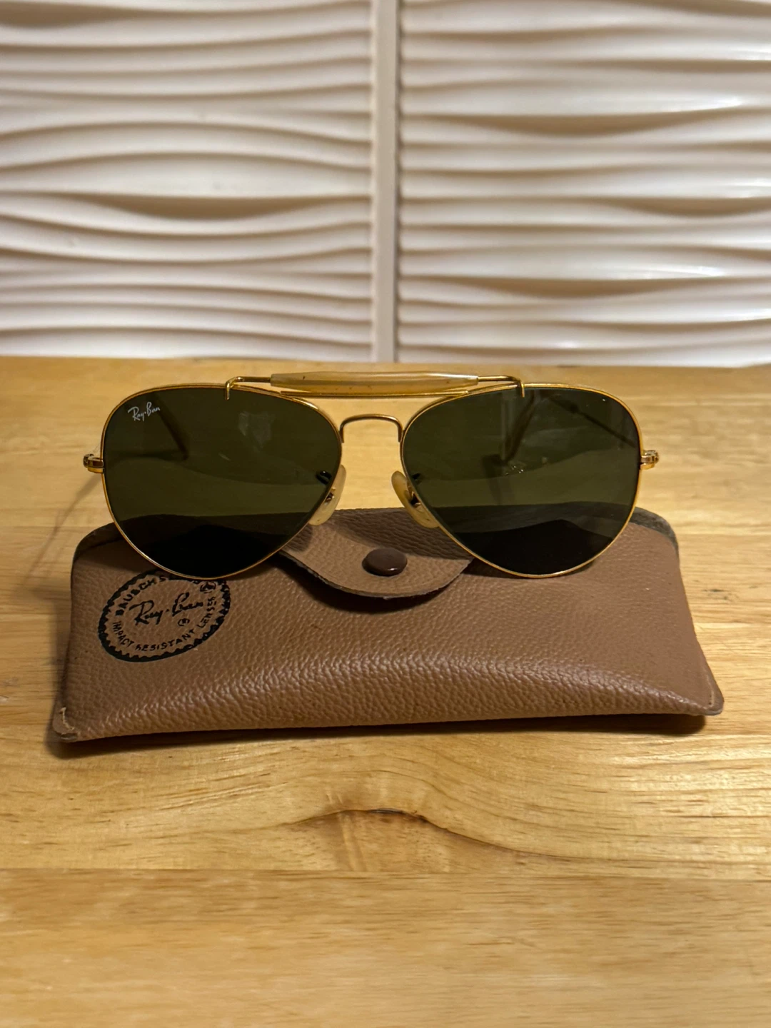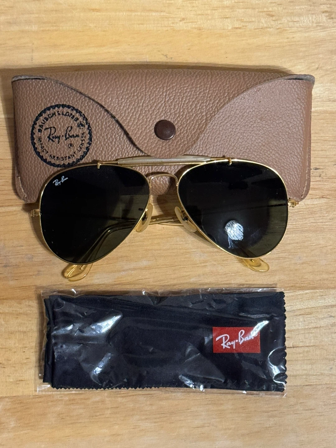 Selling a pair of classic Ray-Ban aviator sunglasses with a gold frame. Includes the original case and cleaning cloth. They're in great condition and ready for a new owner