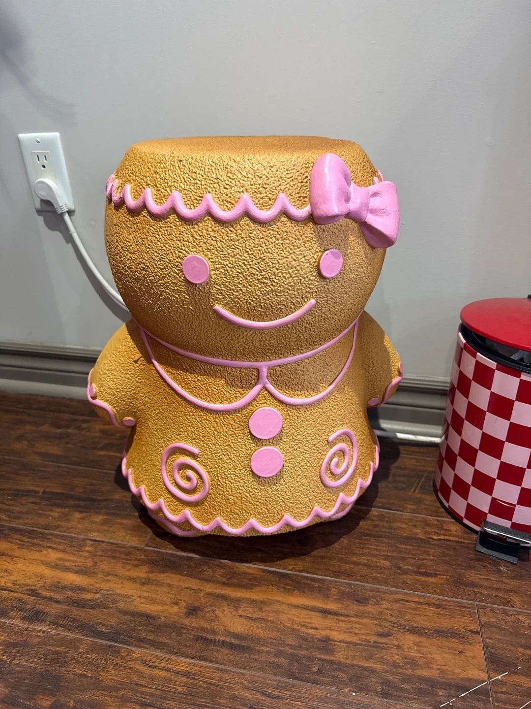 Selling a cute gingerbread girl stool! This adorable stool is perfect for adding a touch of whimsy to any room. It features a charming gingerbread girl design with pink accents. It's in great condition and ready to bring some sweetness to your home!